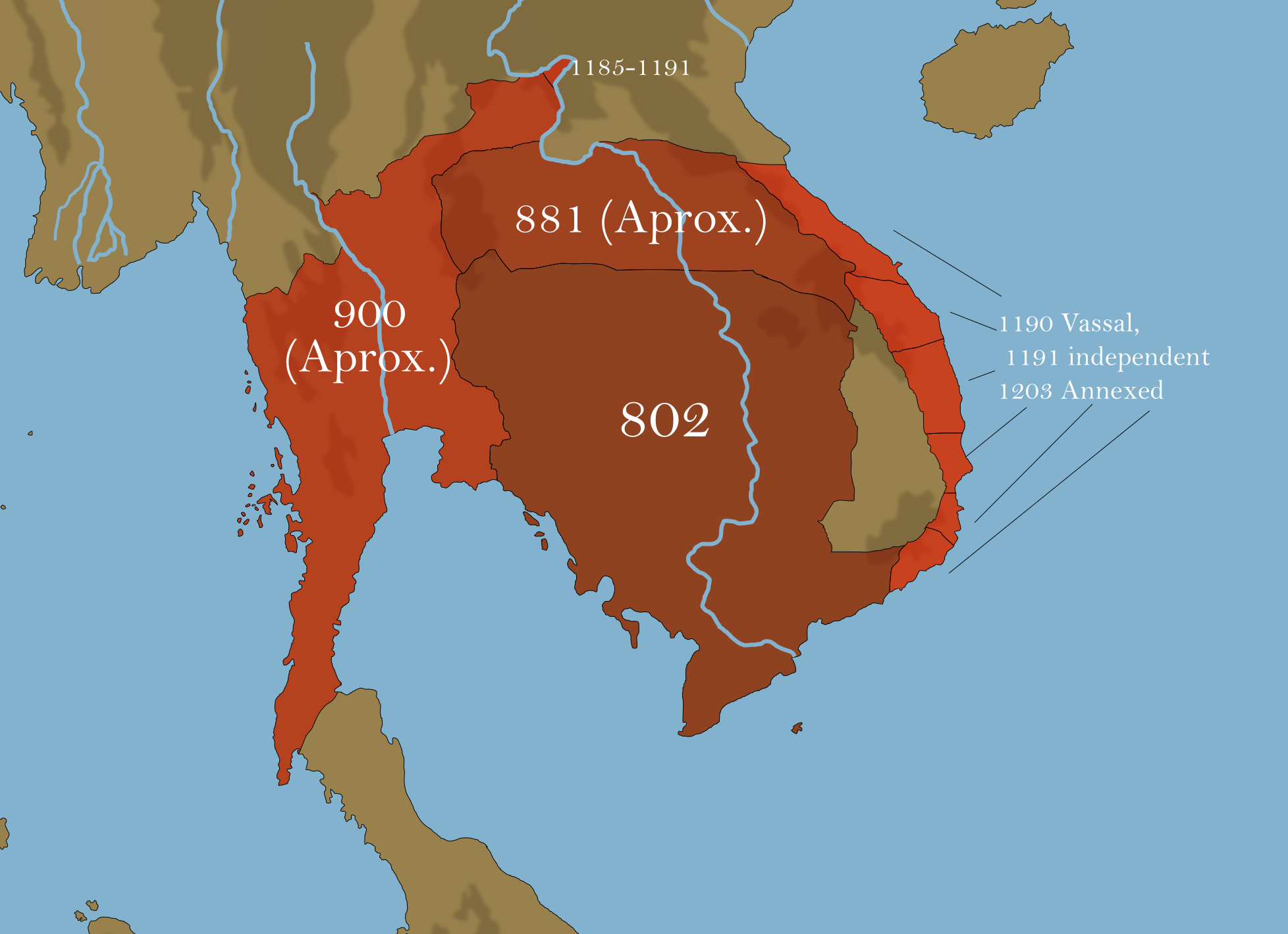 크메르 제국 영토 확장 과정은 앞에 제시한 지도 석 장을 참고하면 되겠고 그 안에서 그 수도 앙코르와 왓푸 위치를 보자.