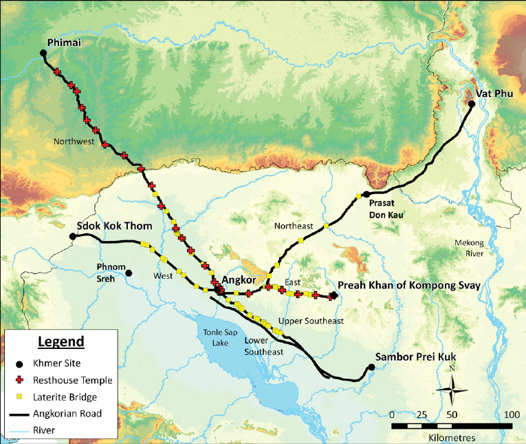 이 지도를 보면 앙코르와 왓푸를 연결하는 간선도로가 있었음을 확인한다. 이 크메르시대를 제대로 공부하려면 저 간선도로를 따라 표시된 지점들을 다 둘러봐야 하지만, 나는 아직 근처에도 가지 못했다. 고작 앙코르와 왓푸 두 군데를 주마간산으로 경험했을 뿐이다.