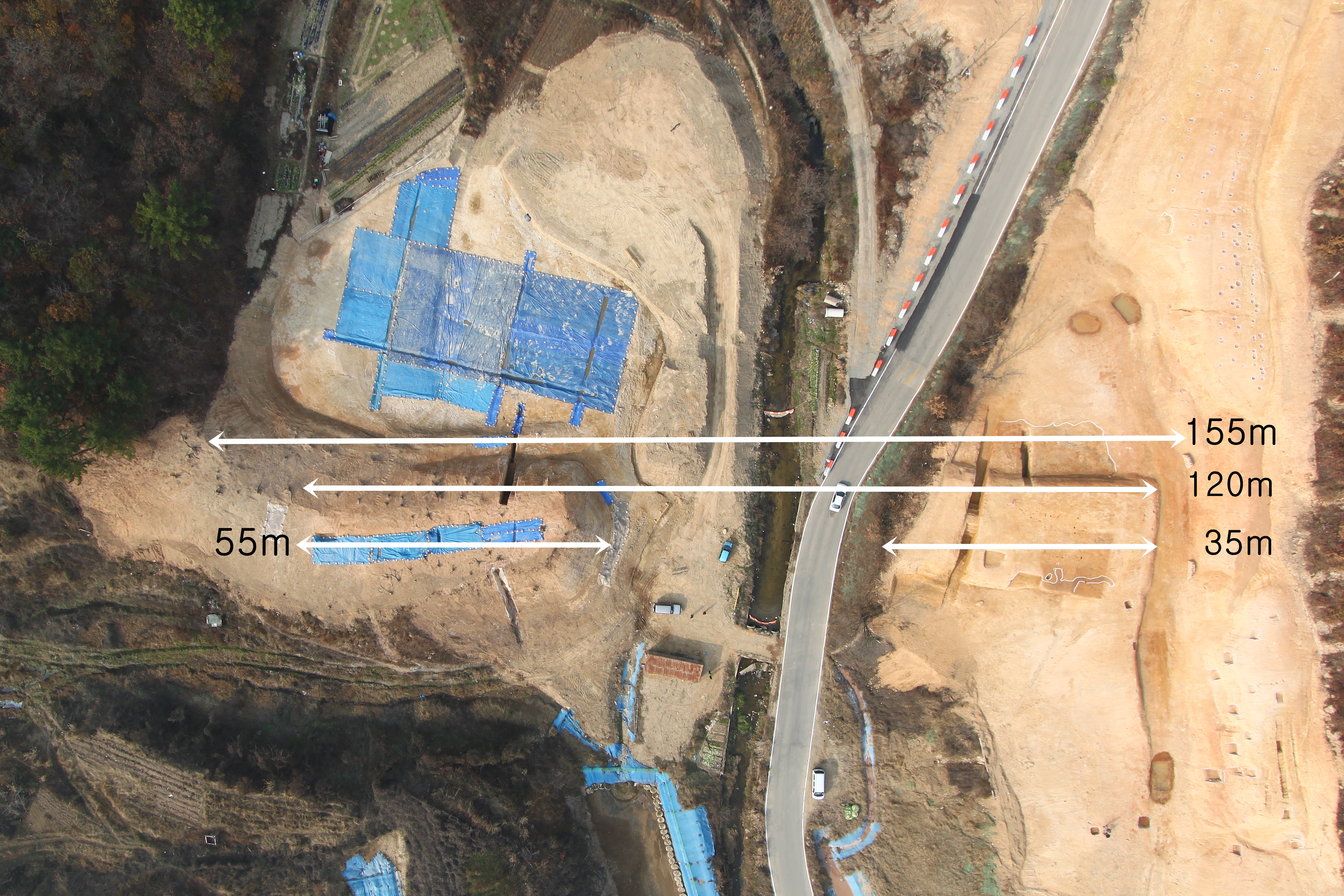 제방 전체길이는 직선거리로 155m, 양쪽 구릉 능선부의 암반 지점에서 흙을 쌓은 성토부(盛土部)를 기준으로 할 때는 120m 정도로 추정됐다.