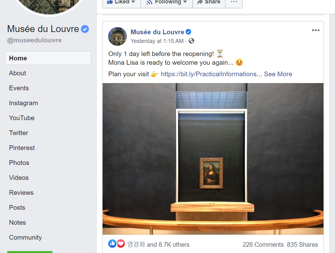 루브르박물관 홈피 들어가 용래가 혹 가짜뉴스를 전하지 아니했냐 확인하니, 진짜로 개장했네? 그에서 개설한 각종 sns 중 페이스북 입성해 보니, 와! 저 사람 열라 불어 잘한다. 듣자니 관장인가 본데, 블라블라 뭐 이렇게 준비했으니 와서 잘 보라 이런 뜻 아니겠는가?