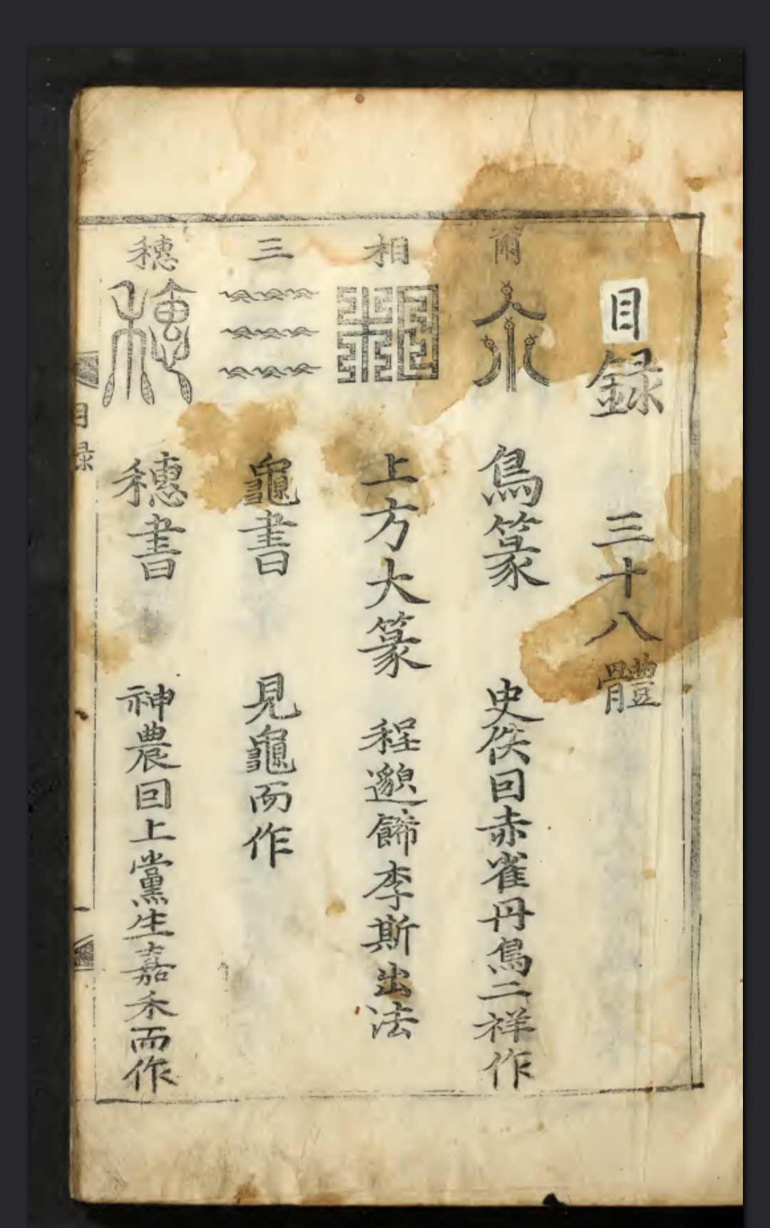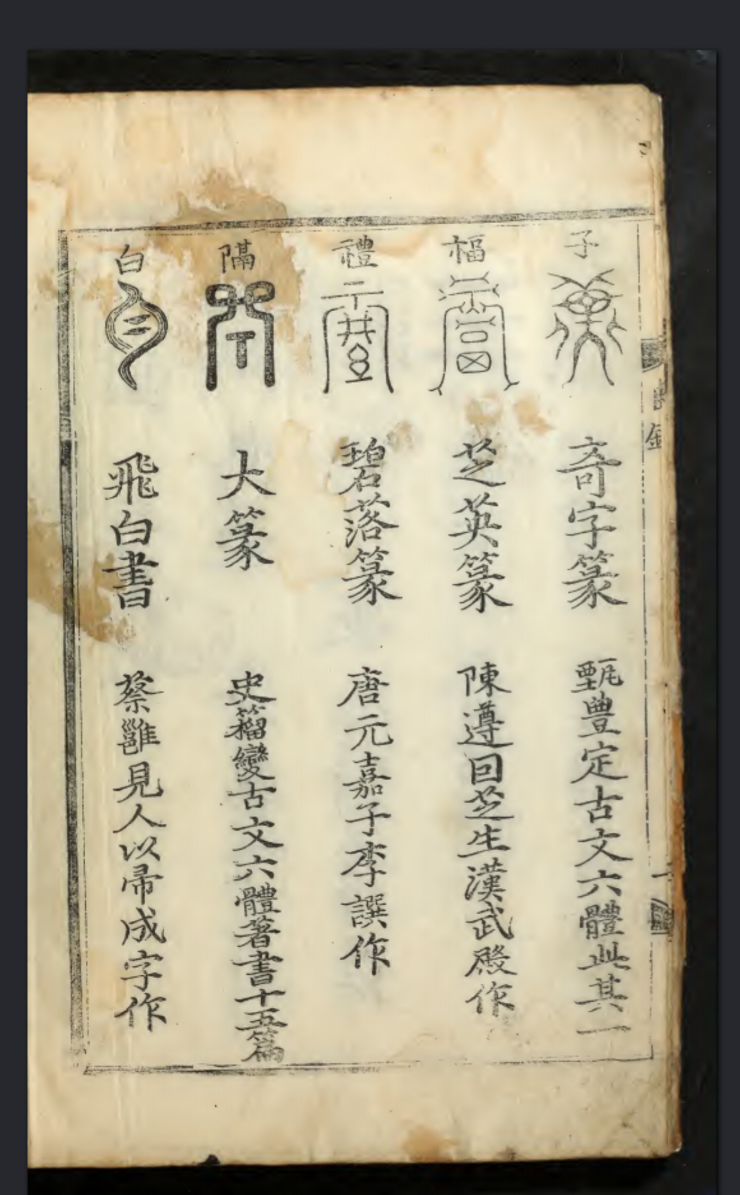 조전(鳥篆) ·상방대전(上方大篆) ·구서(龜書) ·수서(穗書) ·기자전(奇字篆) ·지영전(芝英篆) ·벽락전(碧落篆) ·대전(大篆) ·비백전(飛白篆) ·과두서(科斗書) ·금착서(金錯書) ·조적서(鳥跡書) ·고전(古篆) ·유엽전(柳葉篆) ·수서(殳書) ·현철서(懸銕書) ·전숙전(轉宿篆) ·옥근전(玉筋篆) ·도해전(倒薤篆) ·인서(麟書) ·종정서(鍾鼎書) ·용서(龍書) ·혹두서(鵠頭書) ·정소전(鼎小篆) ·진새전(秦璽篆) ·고정서(古鼎書) ·현침전(懸針篆) ·봉미서(鳳尾書) ·용조전(龍爪篆) ·수운서(垂雲書) ·각부서(刻符書) ·전도전(剪刀篆) ·소전(小篆) ·수로전(垂露篆) ·영락전(纓絡篆) ·태극전(太極篆) 분서(墳書) ·조충전(雕蟲篆)
