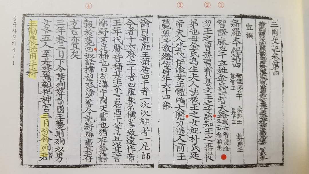 "3월에 (왕이) 州主와 郡主들에게 농사를 권장케 하고, (신라가 이때) 처음으로 소를 몰아서 밭갈이를 했다"