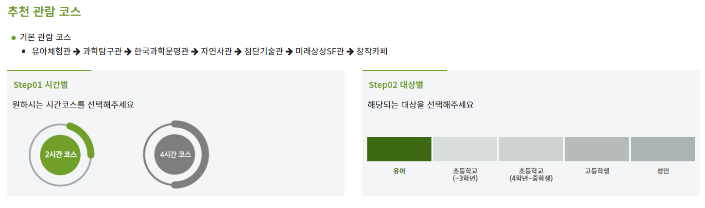 국립과천과학관 홈페이지에 접속하면 머무르는 시간과 대상에 따라 관람코스를 추천해 줍니다.