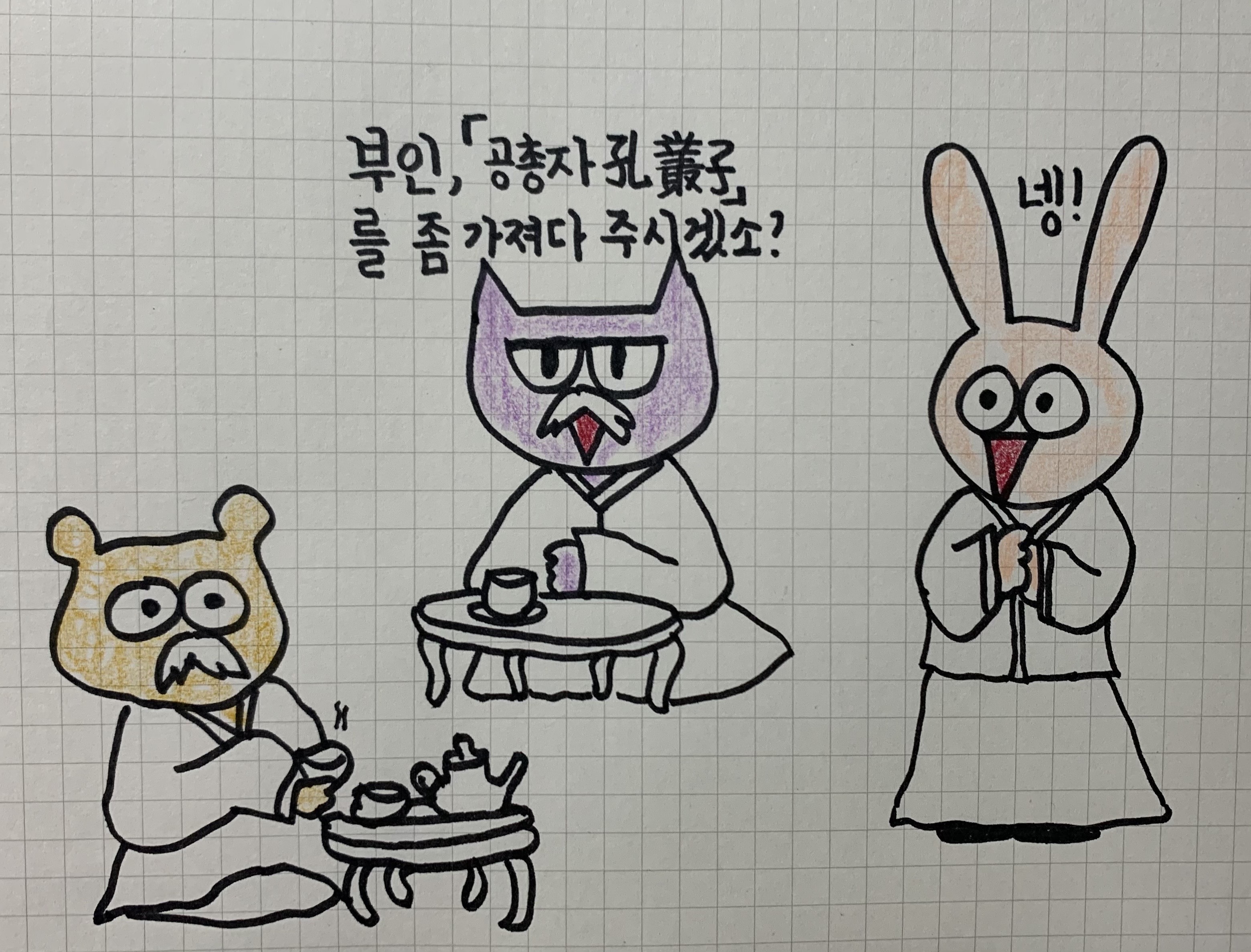 그러고는 (일자무식인 아내를 위해) 언문諺文으로 (각 책의) 권卷과 질秩에다가 제목을 표시해 놓았다. (그러다가 어느 날 집에서) 손님들을 접대하게 대하게 되어 처에게 《공총자孔叢子》를 찾아오도록 함으로써 여러 손님에게 (아내를) 자랑하고자 했던 것이다. (그랬는데) 처가 여종을 시켜 말을 전하기를