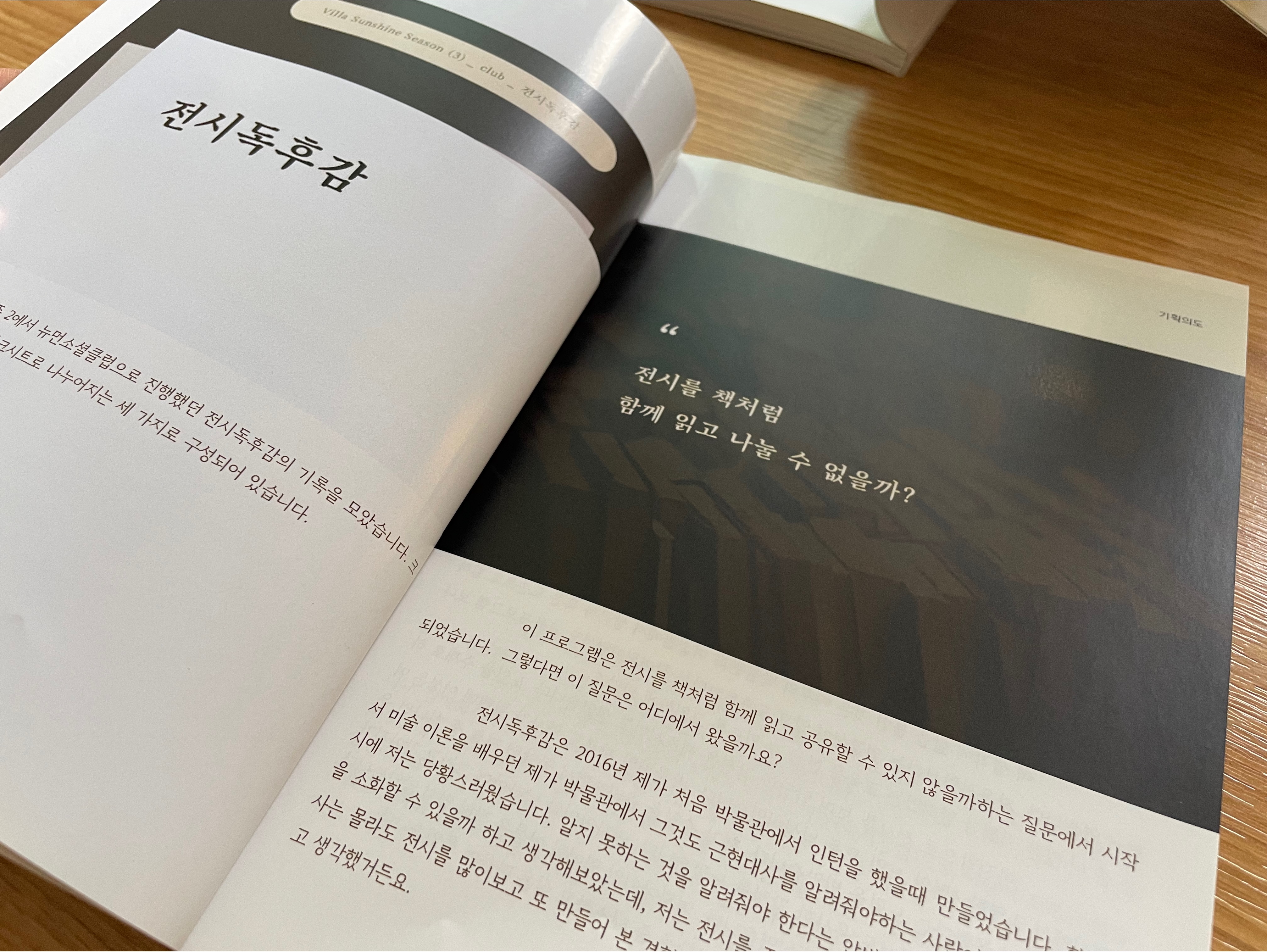 모임을 만든 분에게 왜 이런 모임을 만들게 되었냐고 물으니, ‘전시를 책처럼 함께 읽고 공유할 수 있지 않을까?’하는 질문에서 시작되었다고 합니다.