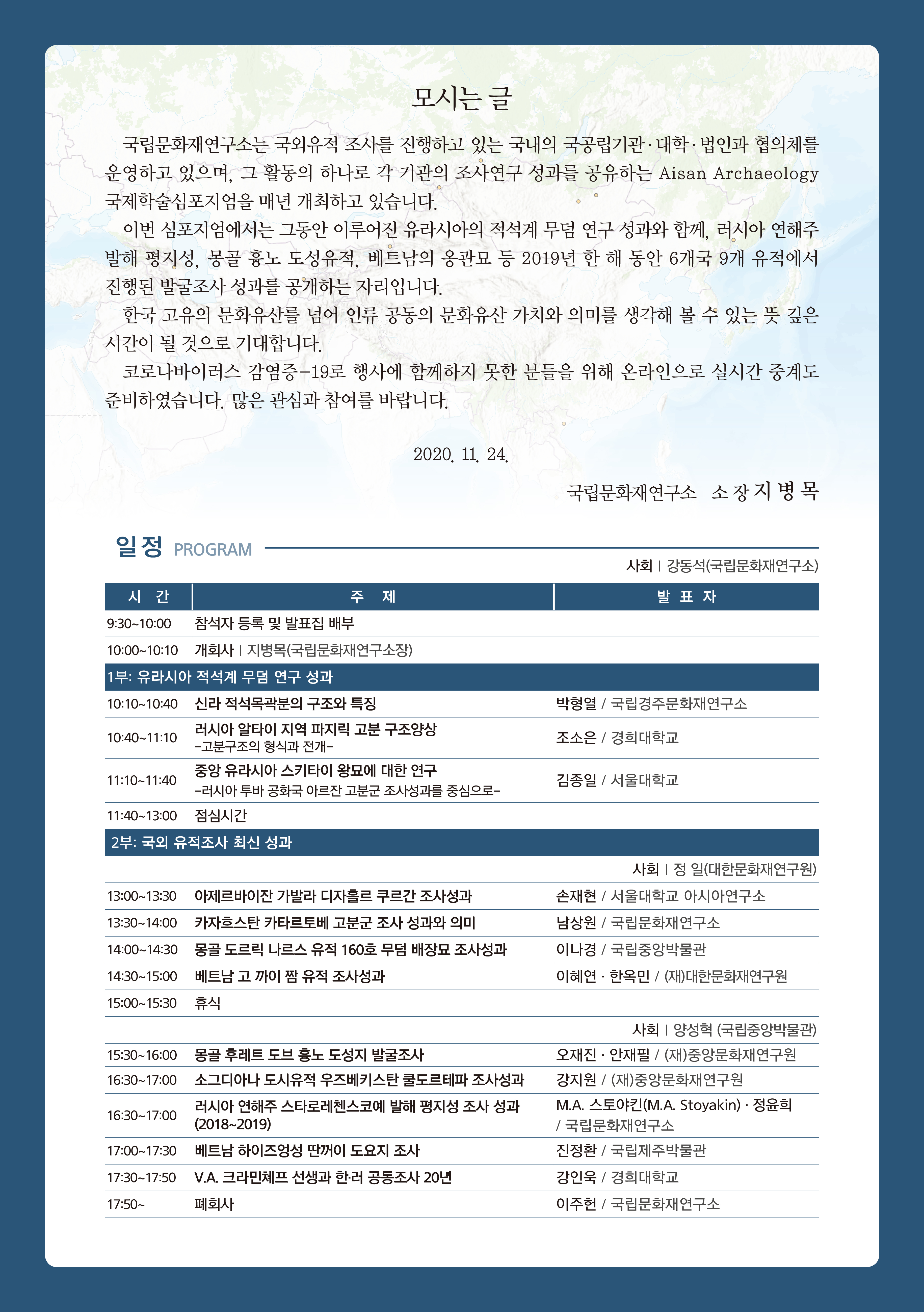 In session 1, in the theme of ‘Research Achievements of Eurasian Stone-piled Tombs’, there will be three presentations including ‘A Research on Scythian Royal Tombs in Central Eurasia – Focusing on Attentive Excavation Result From Arzhan Kurgan in Tuva Republic’. In session 2, there will be nine presentations on the latest excavation outcomes in overseas sites including Azerbaijan, Kazakhstan, Mongolia, Vietnam, and Primorsky Krai, Russia. The presentations will include topics such as ‘Investigation Dizahli kurgan, Gabala, Azerbaijan’ and ‘Archaeological Discoveries of Starorechenskoe Balhae Fortress, Primorsky Krai, Russia (2018-2019).