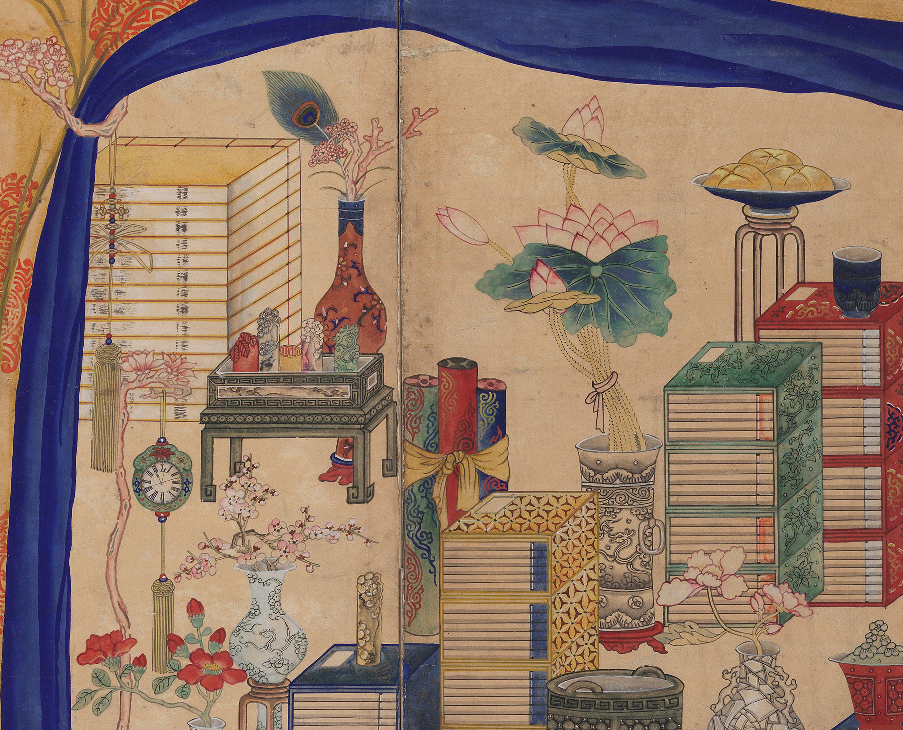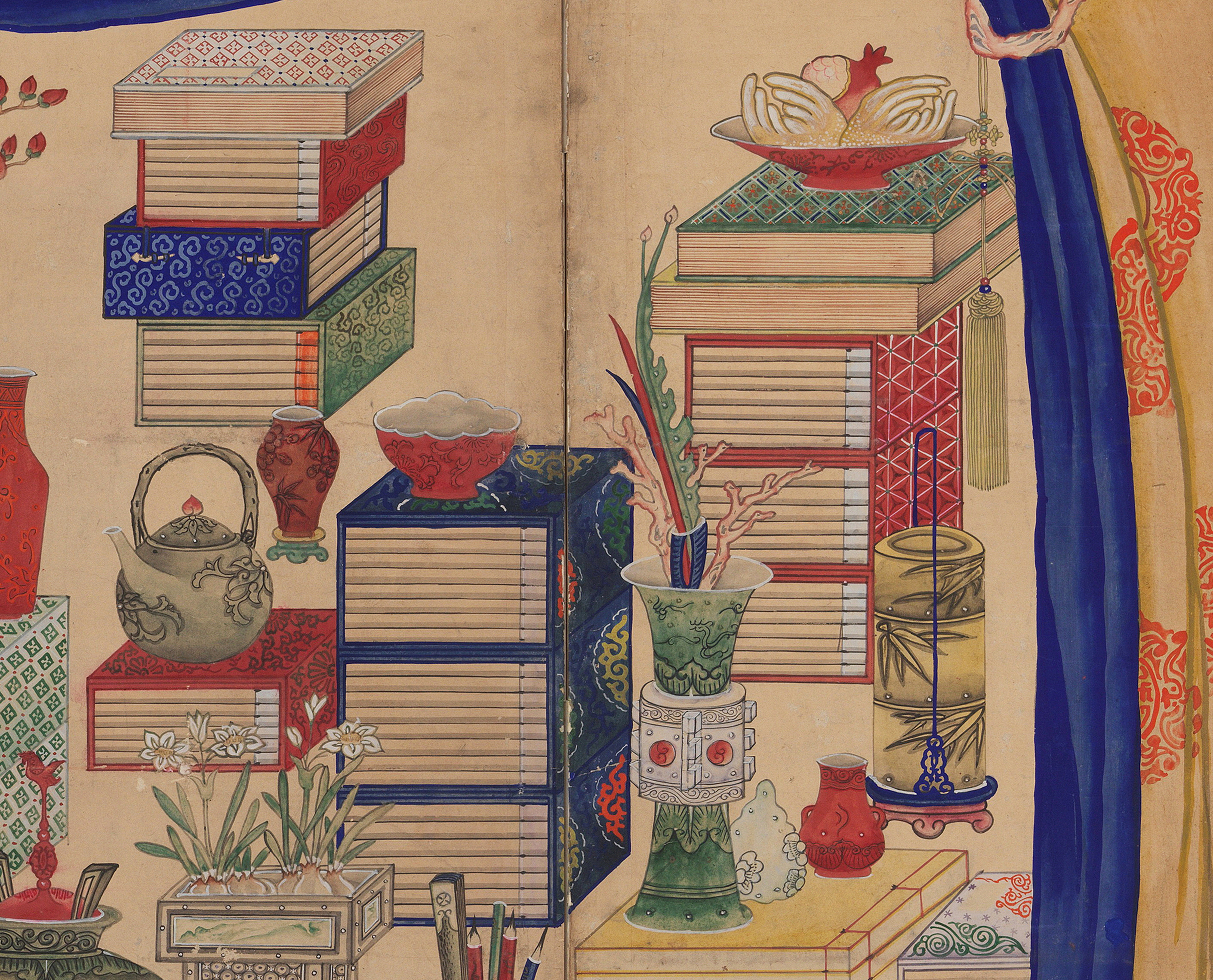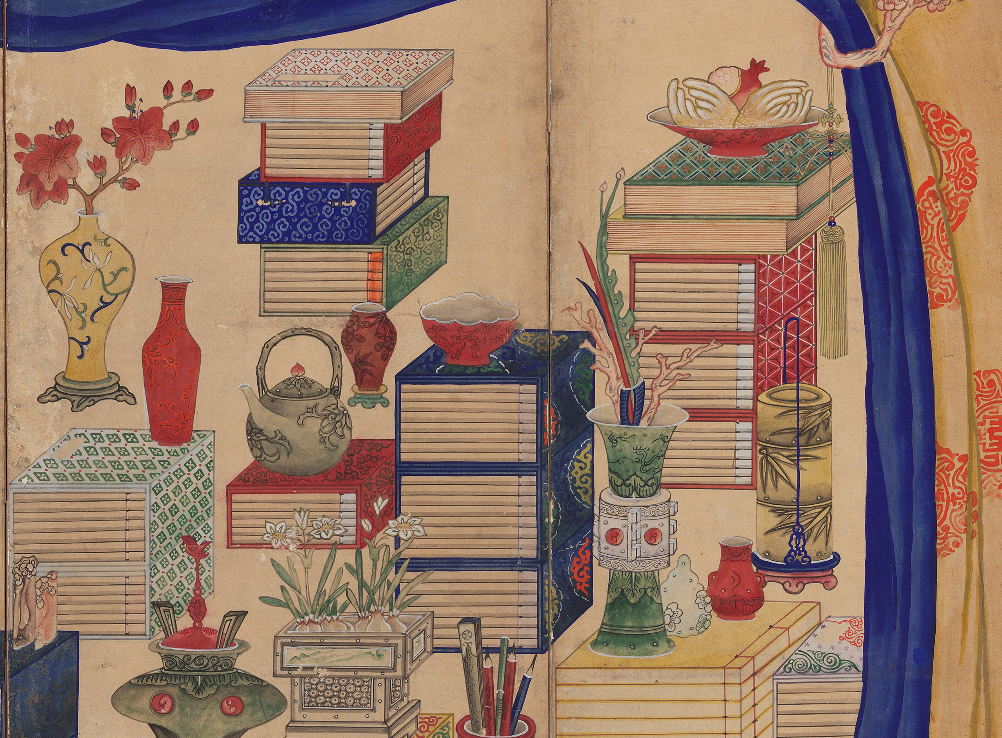 The depiction of books and scholars’ accoutrements in munbangdo paintings demonstrates the royal family’s passion for study and learning. It also illustrates the popular hobby of collecting and appreciating curios.