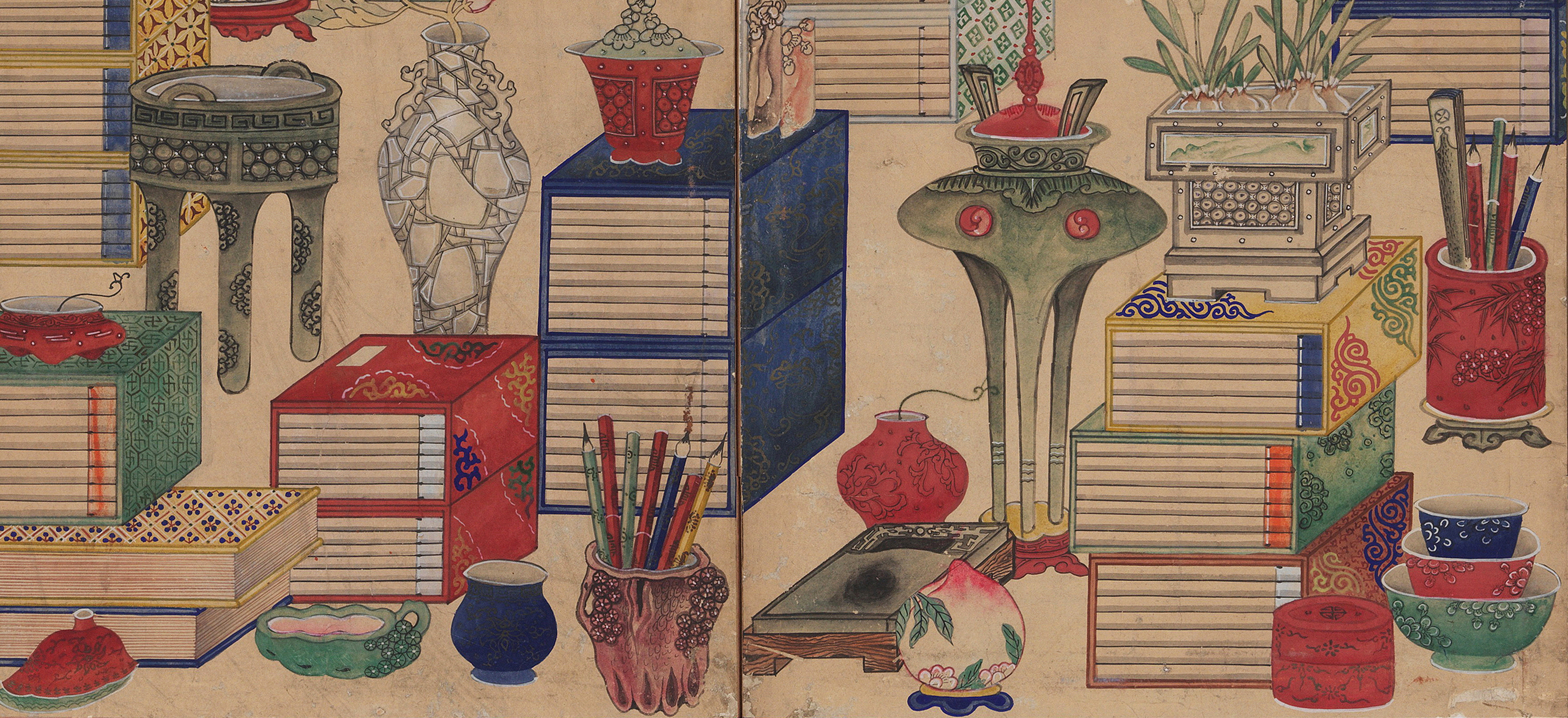 The National Palace Museum of Korea houses a total of four folding screens of books and scholars’ utensils, which demonstrates that munbangdo paintings were produced and utilized in diverse manners within the Joseon royal court.