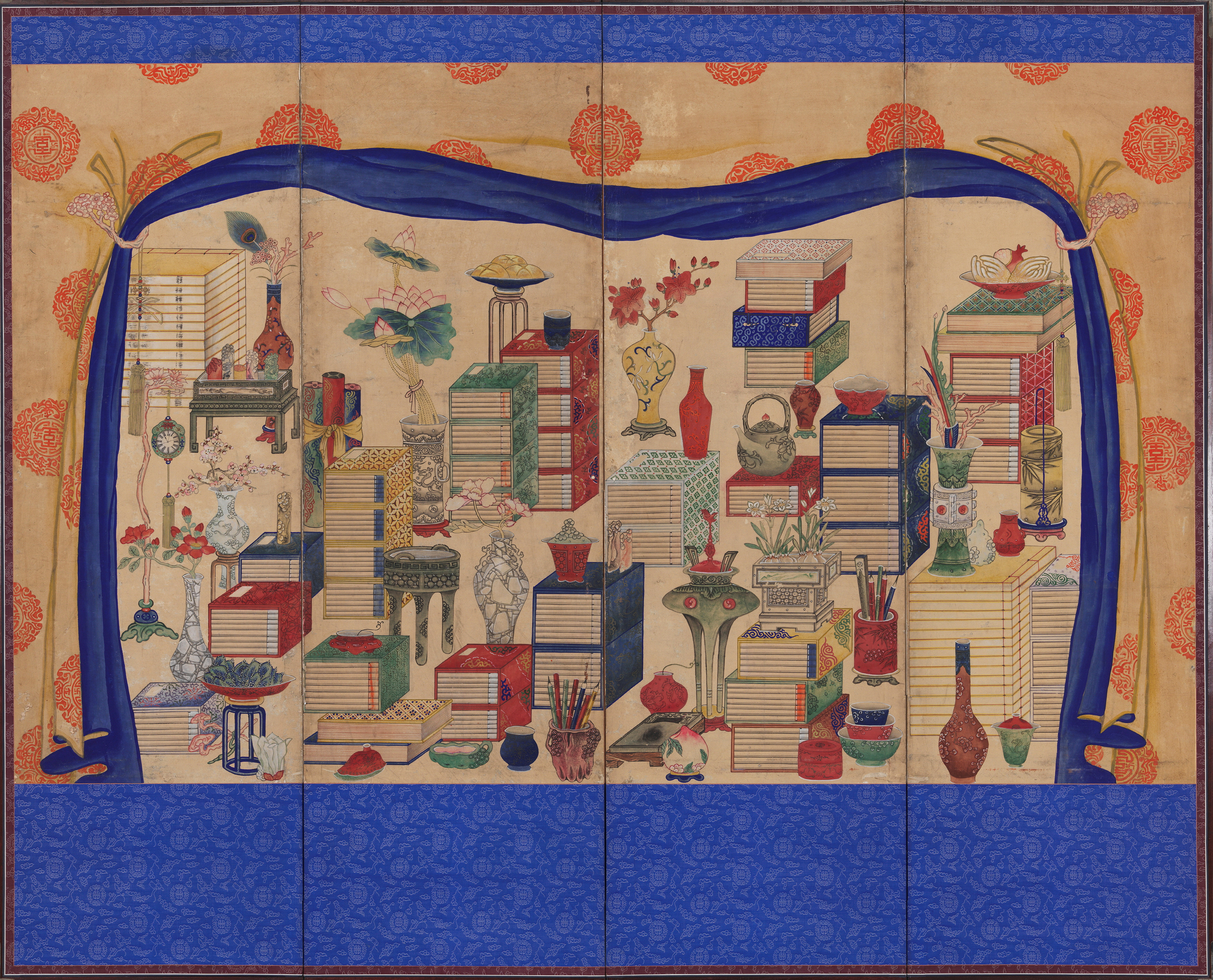 This type of folding screen featuring painted books and curios is known in Korean as munbangdo. They were placed in Pyeonjeon Hall where the king managed everyday administrative matters and in Donggung Palace (the residential space of the crown prince) to convey the wish that he would devote himself to learning.