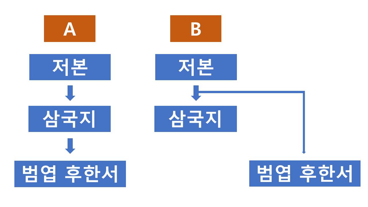 후한서와 삼국지의 한전韓傳에 대한 도식. A는 학계에서 바라보는 선후 관계이며, B가 내가 상정한 관계다. 나는 후한서 한전은 삼국지 한전과 선후관계가 아니라고 본다. 같은 원전을 각기 참조했을 뿐이다.