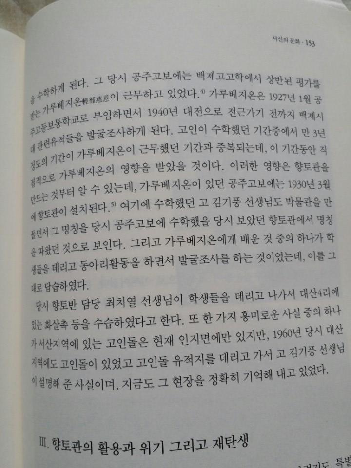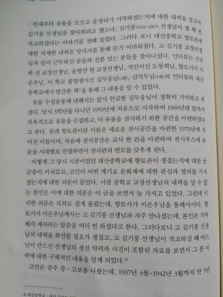 이야기인즉슨, 가루베 얘기를 많이하시던데, 공주고보 그의 제자 분 중에 서산 대산중학교 초대 교장을 지낸 김기풍(1923~2007)이라는 이가 계시는데, 그 분이 향토문화재를 수집하고 이를 토대로 대산중학교에다가 향토관을 만든 분이라면서, 그 분이 일찍이 이런 생각을 한 데는 아마도 가루베 영향이 아닐까 한다는 것이었다.