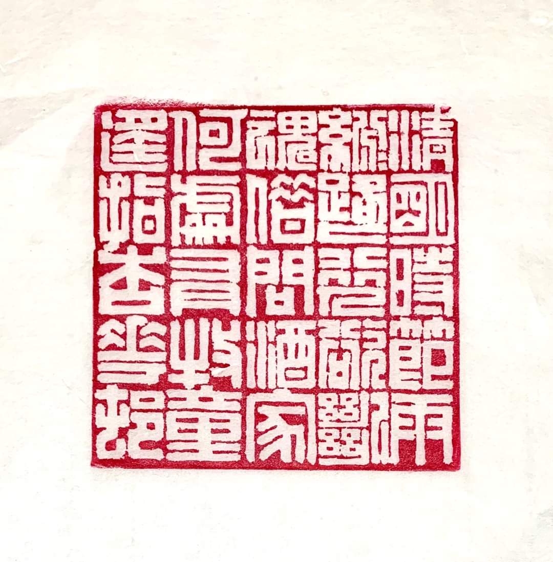 9cm X 9cm 요녕석을 가로 세로 다섯 칸으로 나누니, 새겨야 할 한자는 28자이고, 칸은 25칸이다. 세 글자를 어떻게든 처리해야 한다. ‘분분(紛紛)’처럼 연달아 같은 글자가 이어지면, 두번째 글자를 ‘땡땡’ 점 두 개로 처리해도 된다. 그래서 ‘분(紛)’의 마지막 획에 살짝 ‘땡땡’ 점 두 개를 넣었다. 이제 두 글자가 남았다. ‘상(上)’과 ‘인(人)’이 획수가 적어서, ‘노상(路上)’과 ‘행인(行人)’을 마치 한 글자처럼 한 칸에 새기기로 했다.