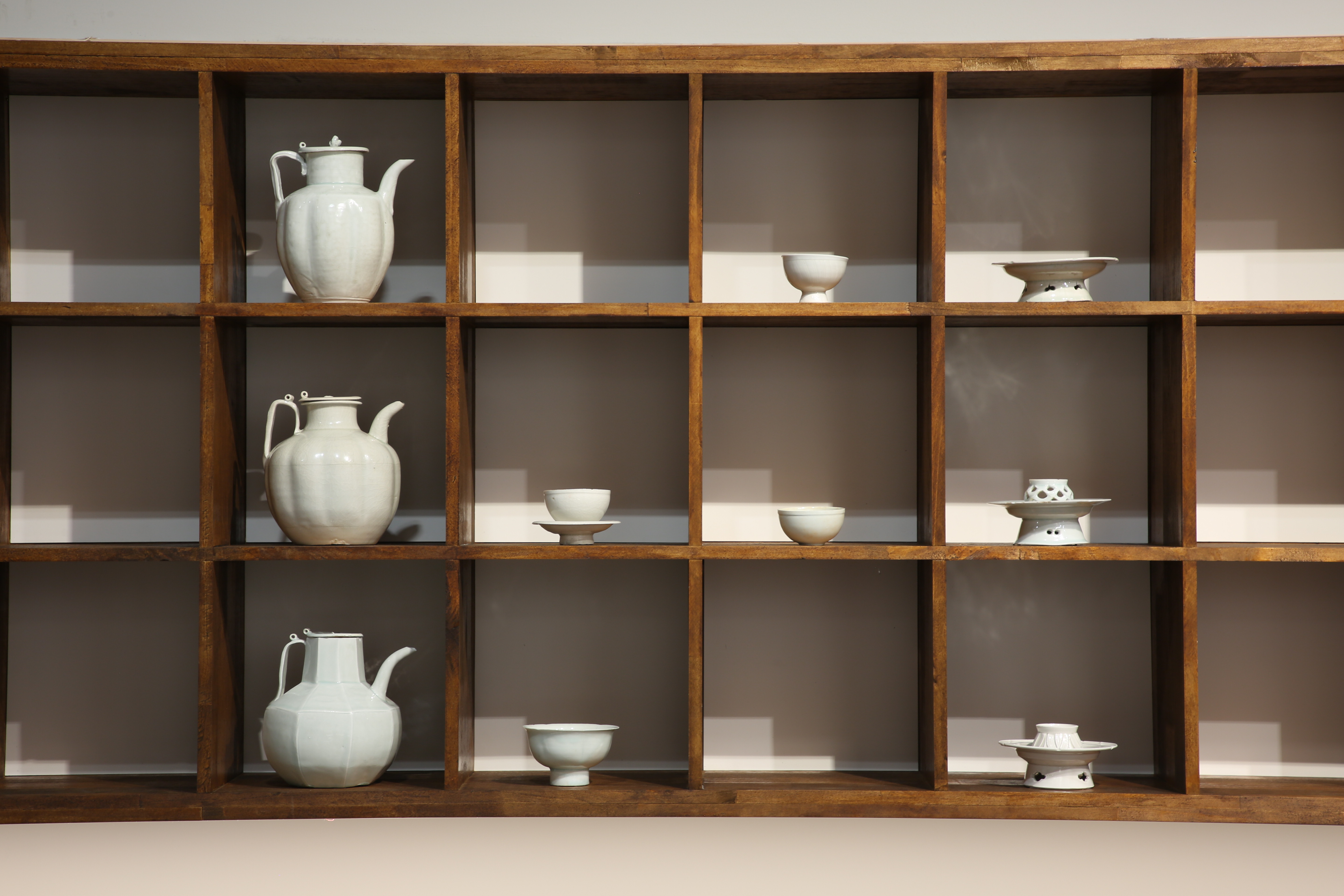 展示は中国絵などを参考に青磁茶具と酒器を分類し、使い方を説明した空間で始まる。