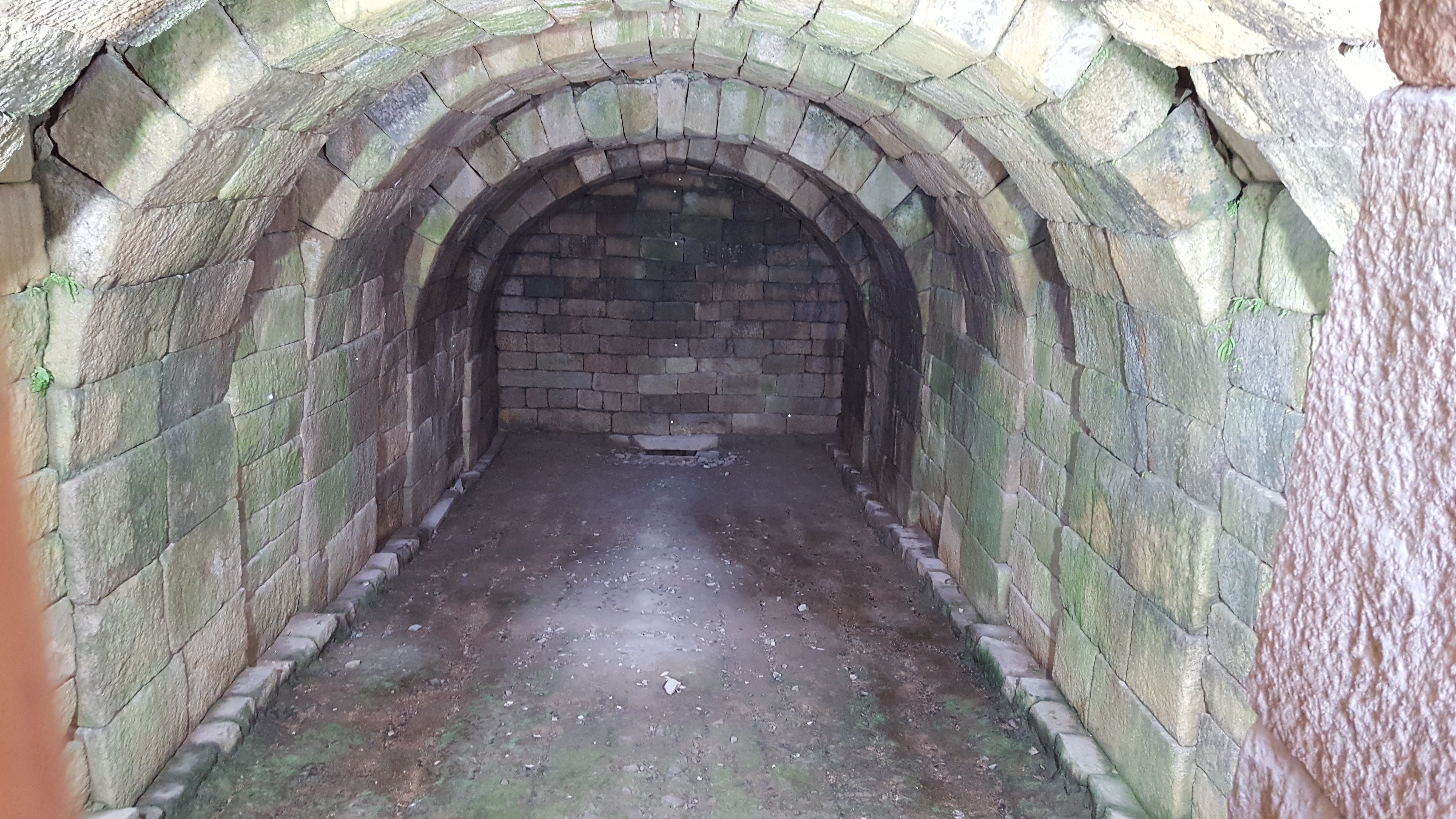 The storage facility can be entered by a descending stairway on its southern side, and has three ventilation ducts installed on its arched roof.