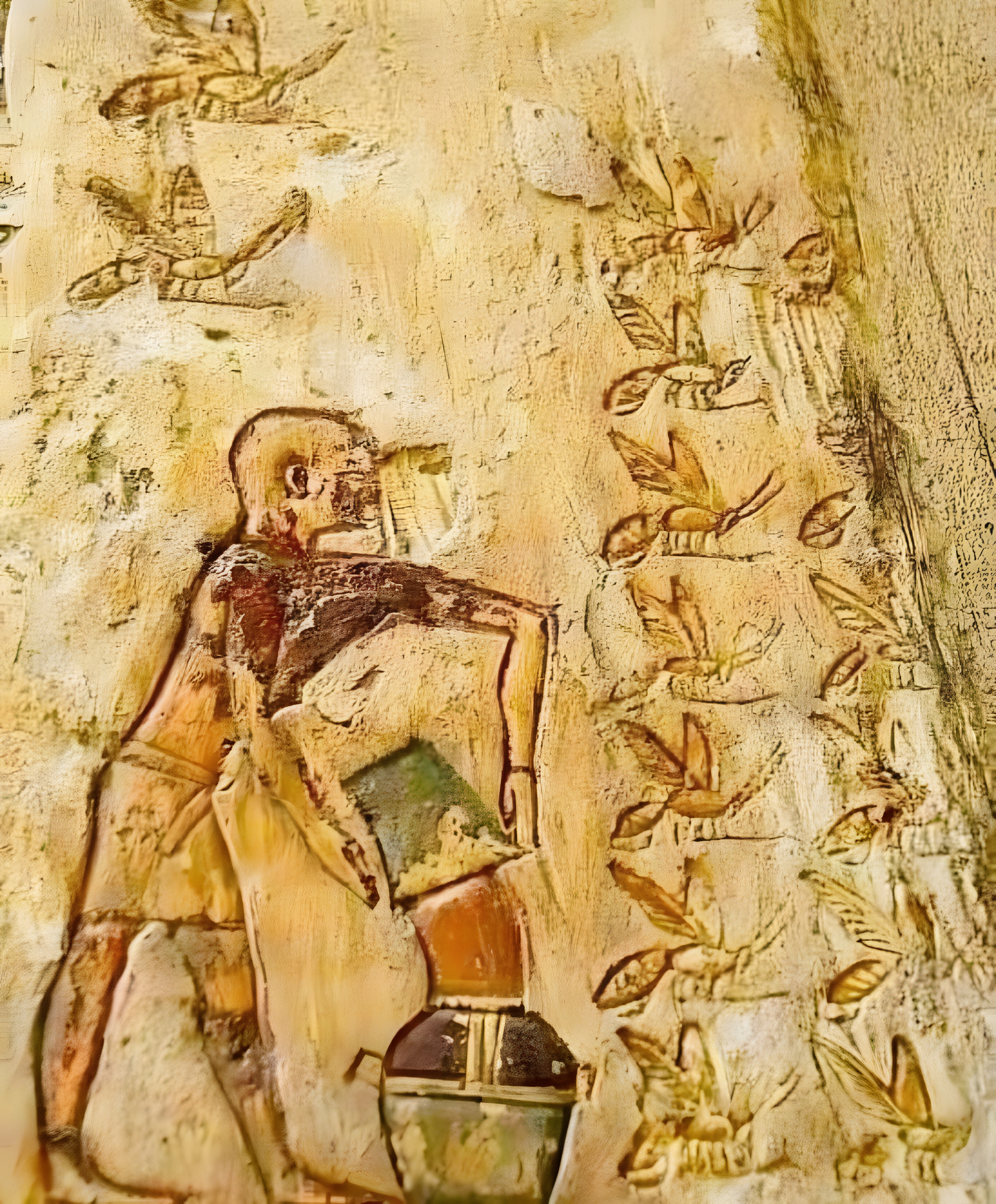 고대 이집트 제26왕조 시대 유산으로 아마도 벌을 돌보는 양봉업자일 어떤 사람이 무릎을 꿇고서는 두 팔 들어 벌이 있는 곳을 향한다.