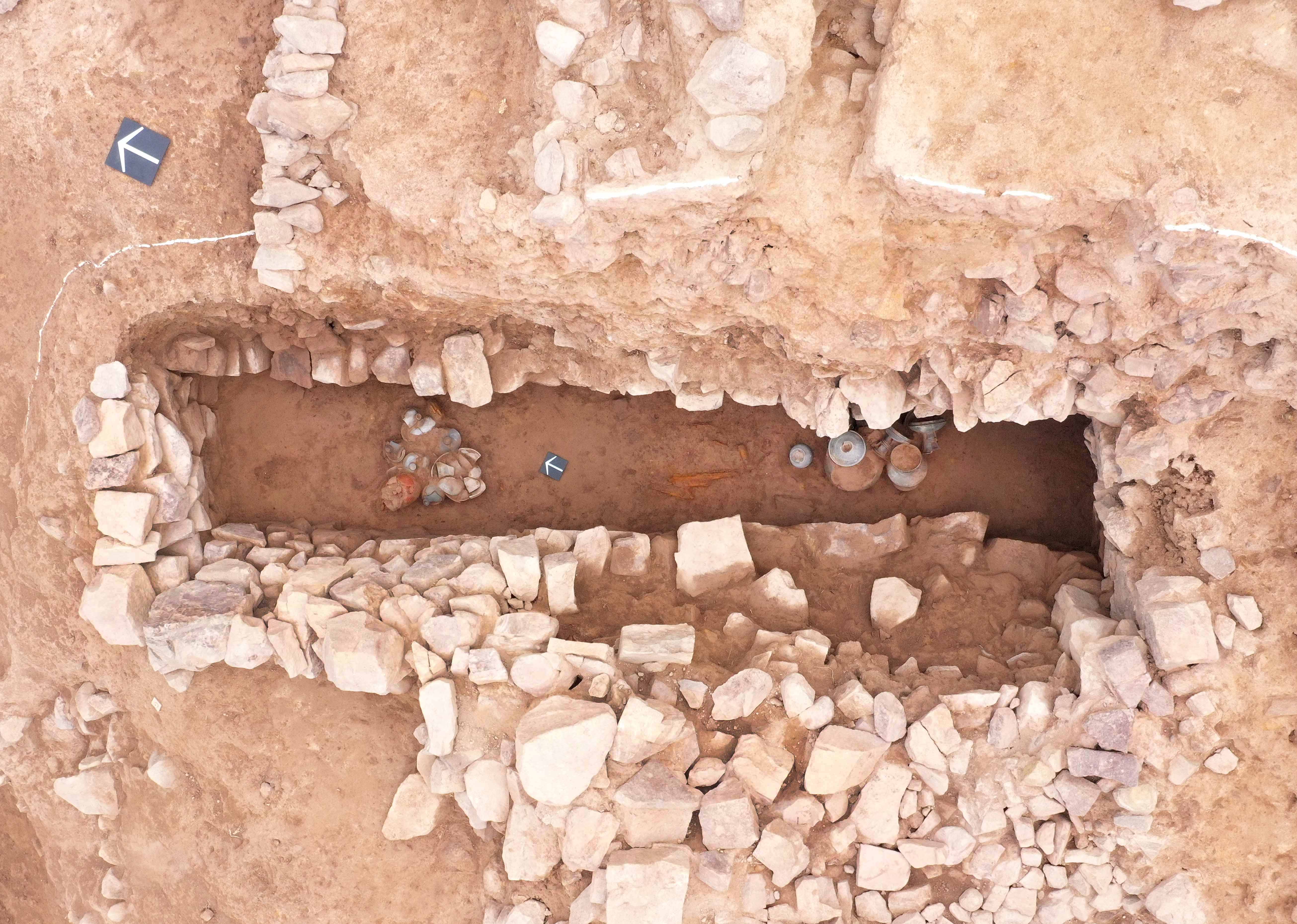 西の副葬遺物は鉢形器臺と長頸壺を2セットでおいたが、北の器臺は長頸壺の端に小型の有蓋高杯8点を配置したのに対し、西器臺は長頸壺の端に小型の赤色軟質甕と有蓋硬質甕8点を配置した独自の副葬面が確認された。