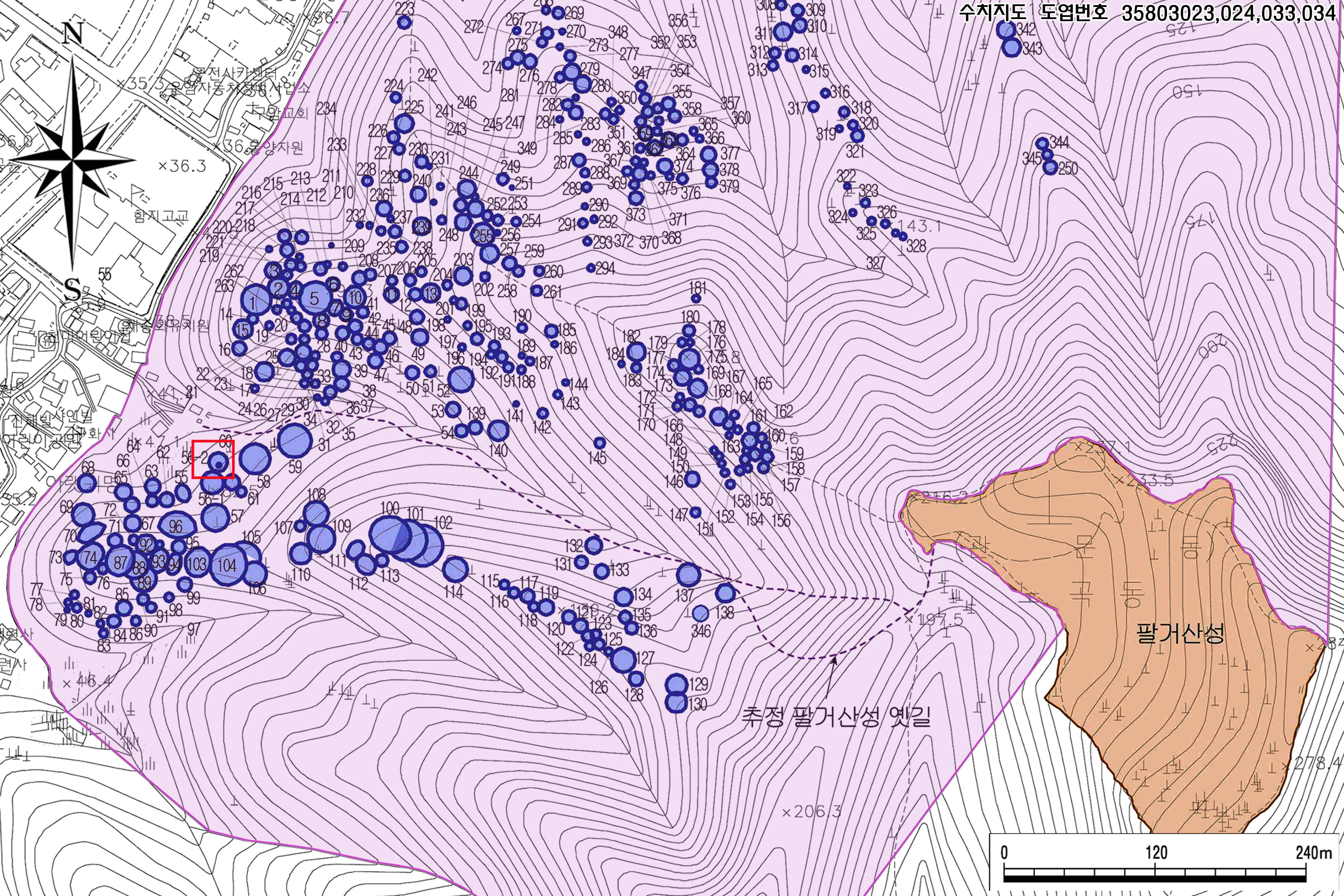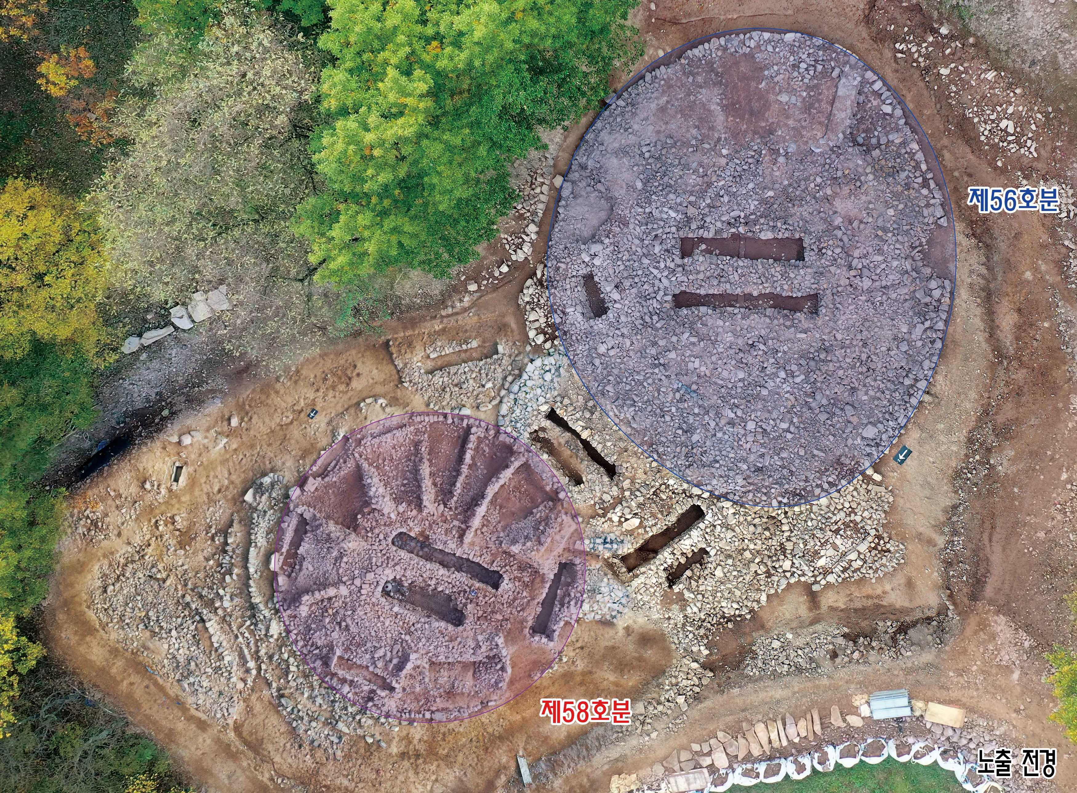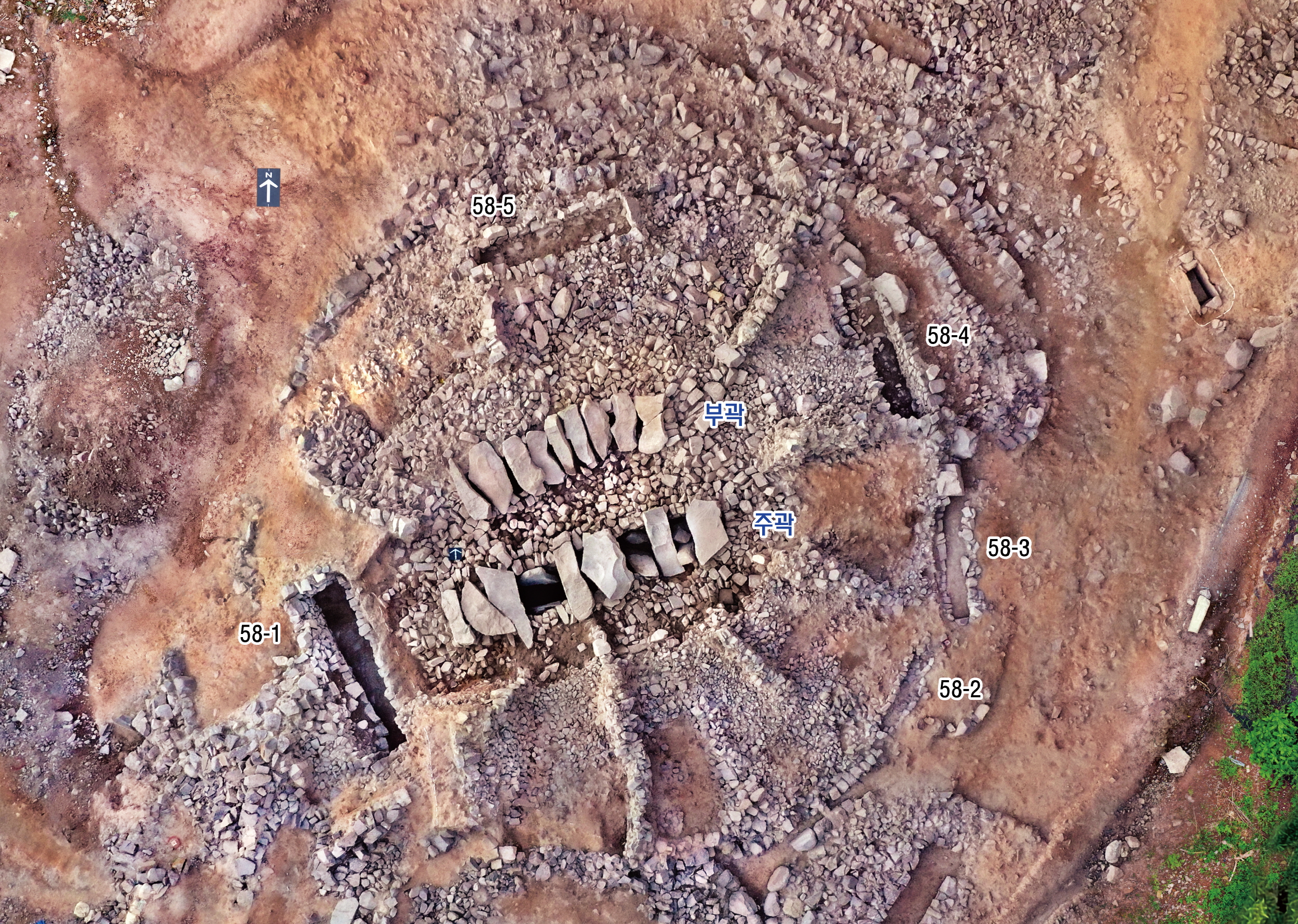 • 追加造成された倍葬墓は本墳の東側から護石列に沿って5基が造成、このうち4基(第58-1〜4號)は、本墳の護石を部分的に毀損して造成されたのに対し、1基(第58-5號)は、護石の內側にジョソンドゥェム。倍葬墓は本分の區劃石列によって分割されたエリアの端に1基ずつ配置されており、本墳の護石を短壁に利用(第58-3号)、または護石を押し出して壁石を構築した面(第58-4號)も確認された。倍葬墓は本墳の護石列に貼り付け、別の護石を構築したが、その中で北の2基(第58-4・5号)は、二重に護石を備える。
