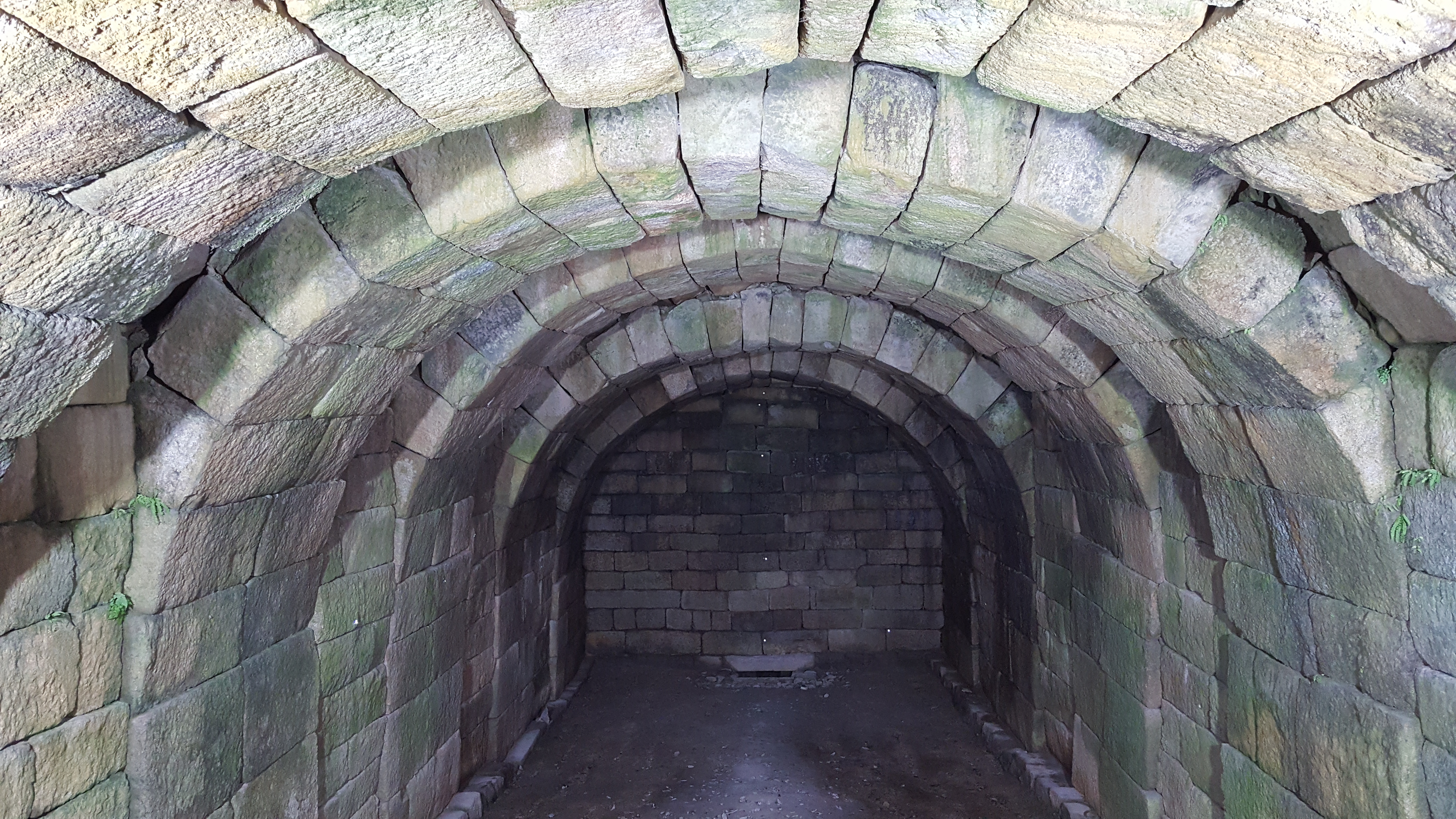 The storage facility can be entered by a descending stairway on its southern side, and has three ventilation ducts installed on its arched roof.