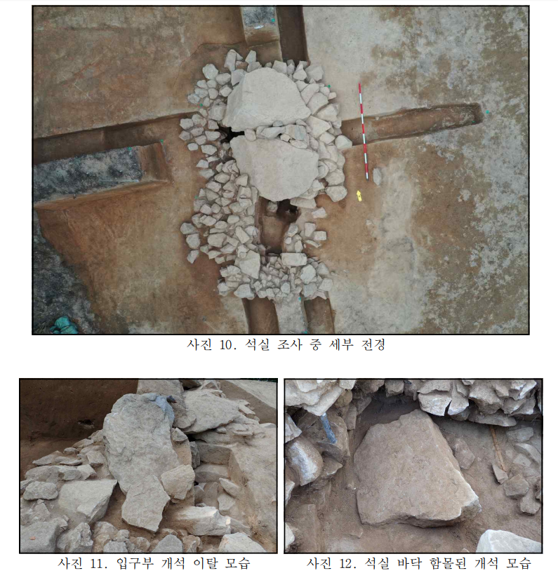 석실로 통하는 출입문은 남쪽 벽 동쪽에 치우쳐 확인된다. 너비 96㎝, 높이 85㎝가량. 입구는 14~24㎝가량되는 자연돌을 질서 없이 밖에서 채워쌓아 막음했다.