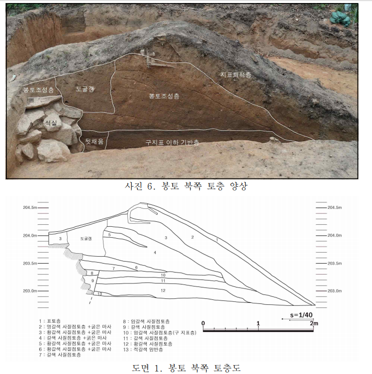 고분은 서쪽에서 동쪽으로, 북쪽에서 남쪽으로 낮아지는 경사지대에 조성되었고, 봉토는 구지표에서부터 석실을 감싸는 형태다. 구지표 위로부터 갈색 사질점토-황갈색 사질점토를 덧붙여 석실을 지탱하기 위한 구축토를 쌓고 그 위로 갈색 사질점토를 두껍게 쌓아 석실을 감싼 뒤 마지막으로 황갈색을 띠는 사질점토를 덮어 마무리한 것으로 보인다.
