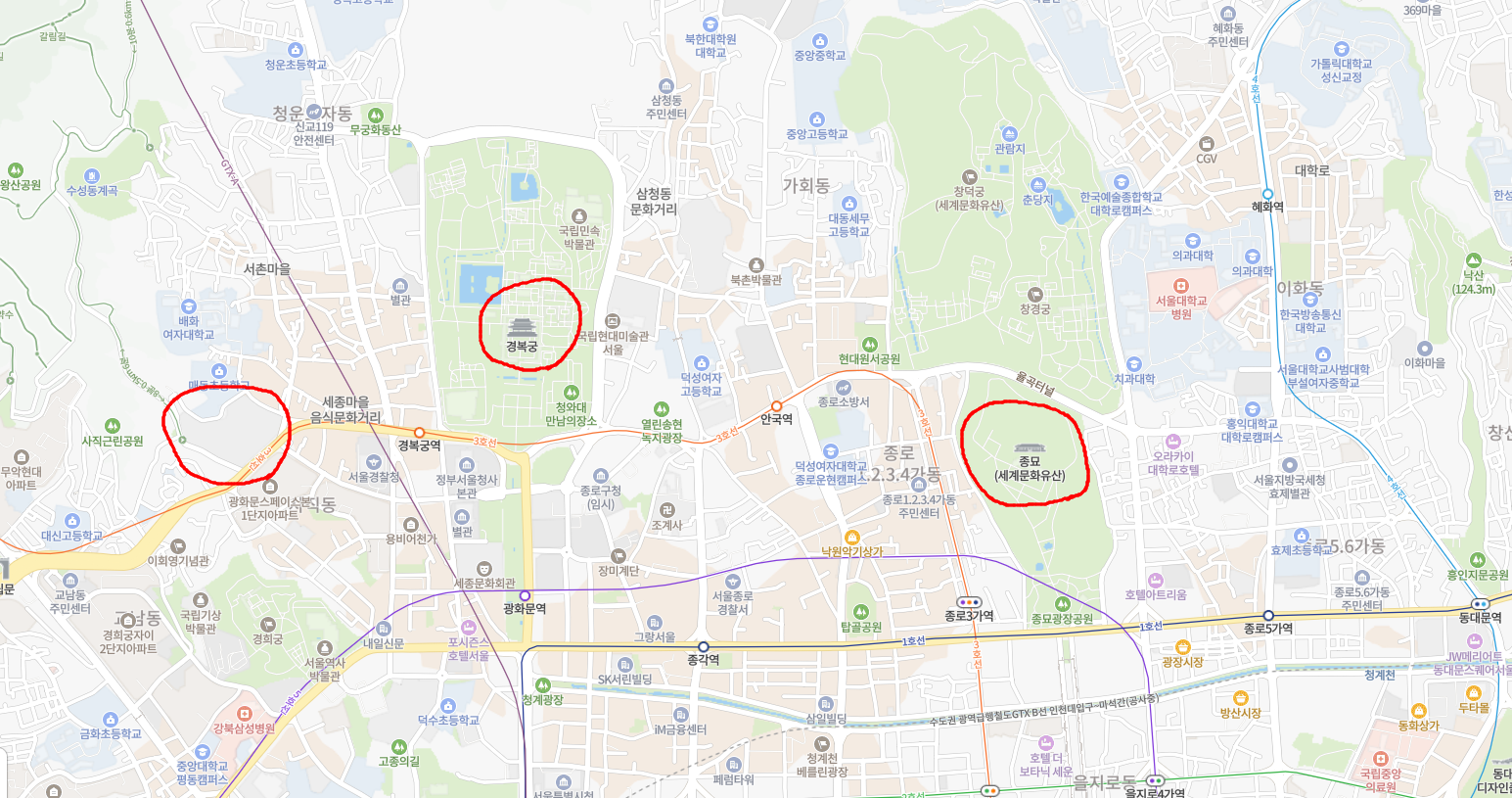 나아가 사직단과 종묘는 경복궁 중심 이격 거리는 차이가 있지만 동일한 위도에 위치함을 본다.