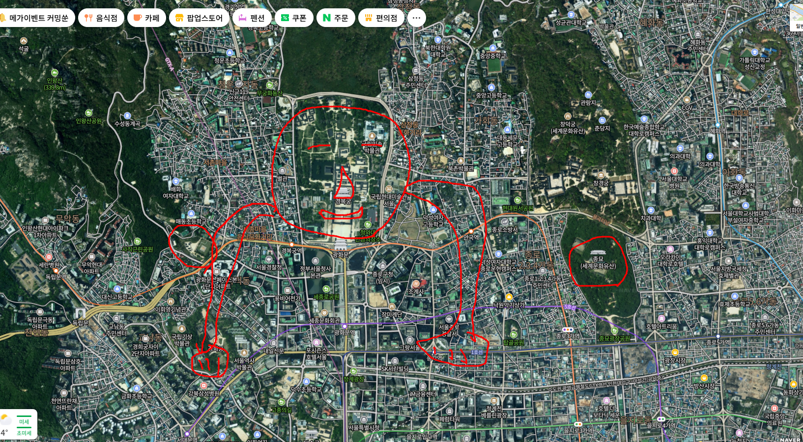 사직단은 경복궁에서 더 뻗어나간 지점이어야 했지만, 산이 막아 섰다.