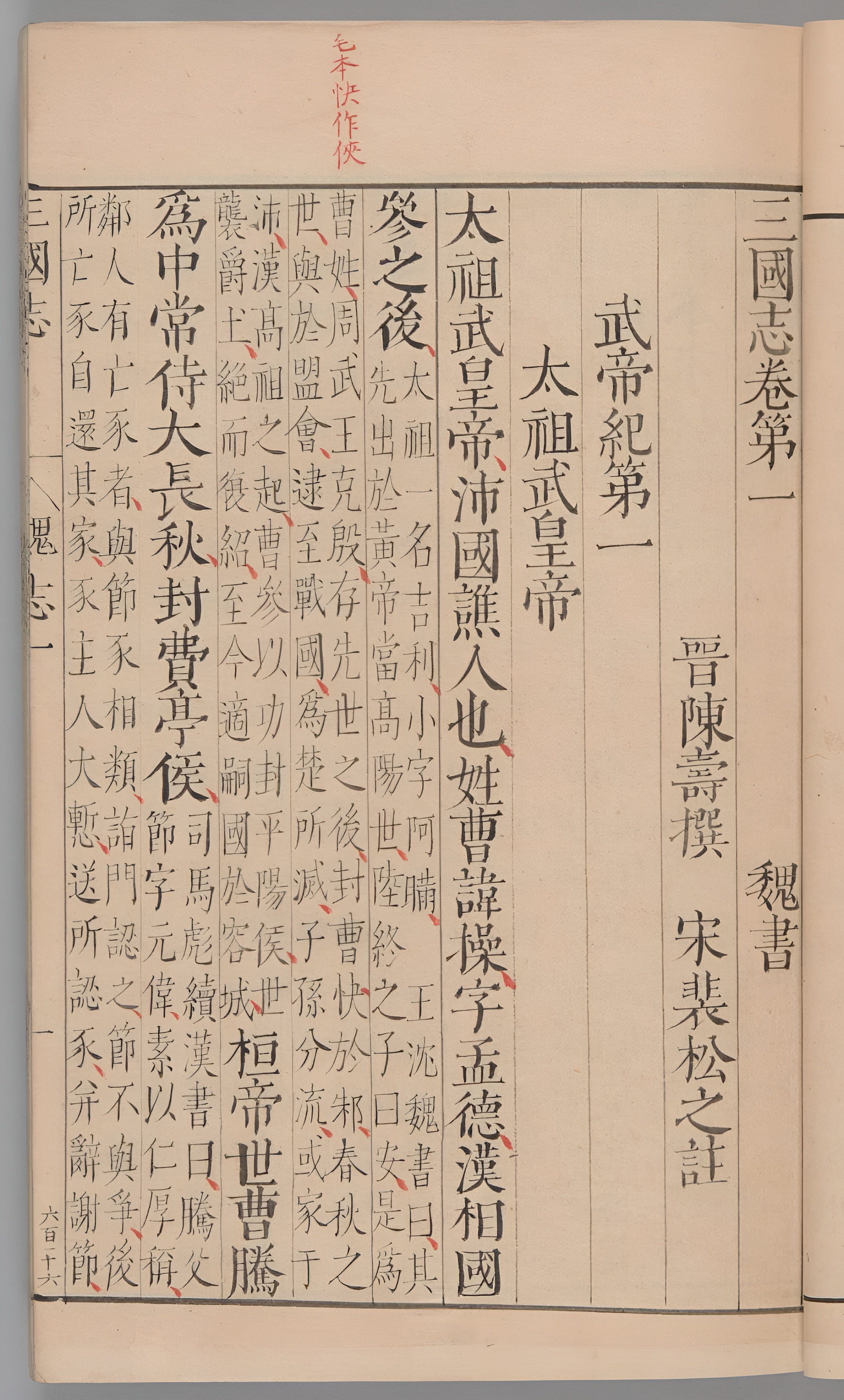 * 이 판본은 다른 명대 『삼국지』 판본과 마찬가지로 『진서』 「진수전」 전문과 『송서』 「배송지전」 요약문을 권제1(卷第一) 앞에 판각했고,
