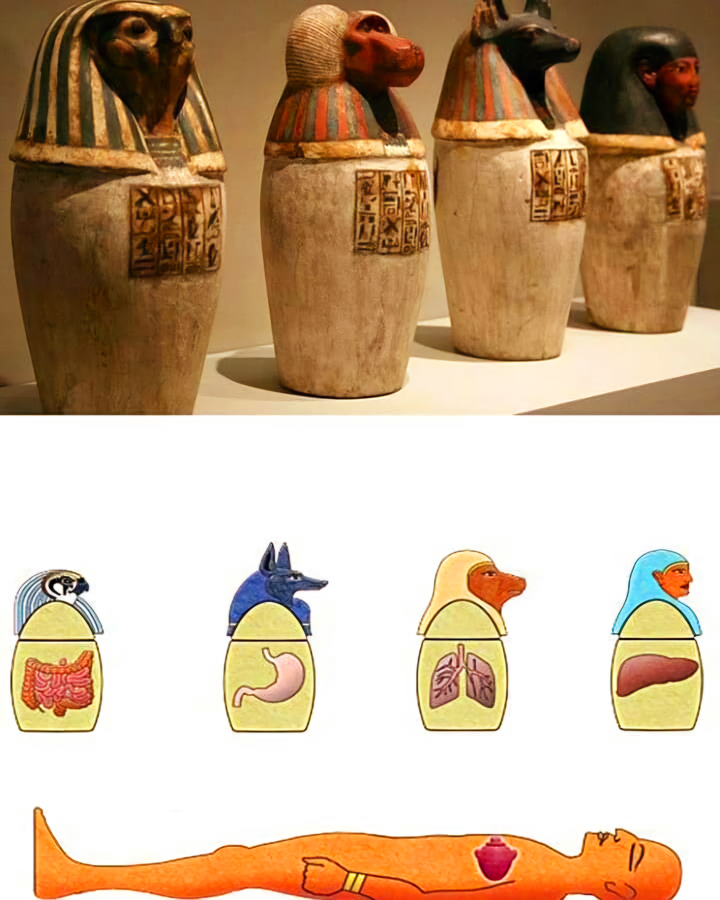 개코원숭이baboon 머리를 한 하피Hapy가 폐를 지킨다. 인간 머리를 한 임세티Imsety는 간의 수호자였다. 자칼 머리를 한 두아무테프Duamutef 는 위와 창자를 지키고, 매 머리를 한 케베세누에프Qebehsenuef는 하부 창자를 지켰다.
