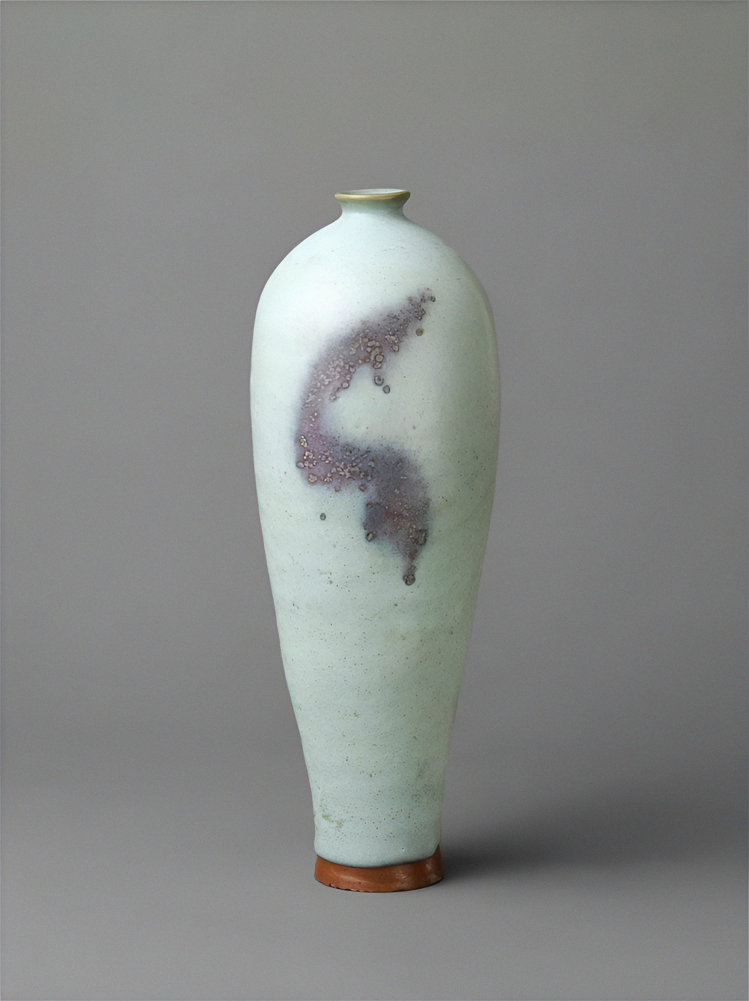 푸른 유약을 잔뜩 바르고 보라색 장식이 튀는 이 병은 이전 송나라 시대 준樽을 계승했지만 이렇게 길고 좁은 모양은 몽고족 유습이라 봐야 한다. 이와 비슷한 갈색 유약 병이 내몽골 무덤 (1312년)에서 출토되었는데, 포도주를 담는 데 사용했다는 네 글자가 확인된다.