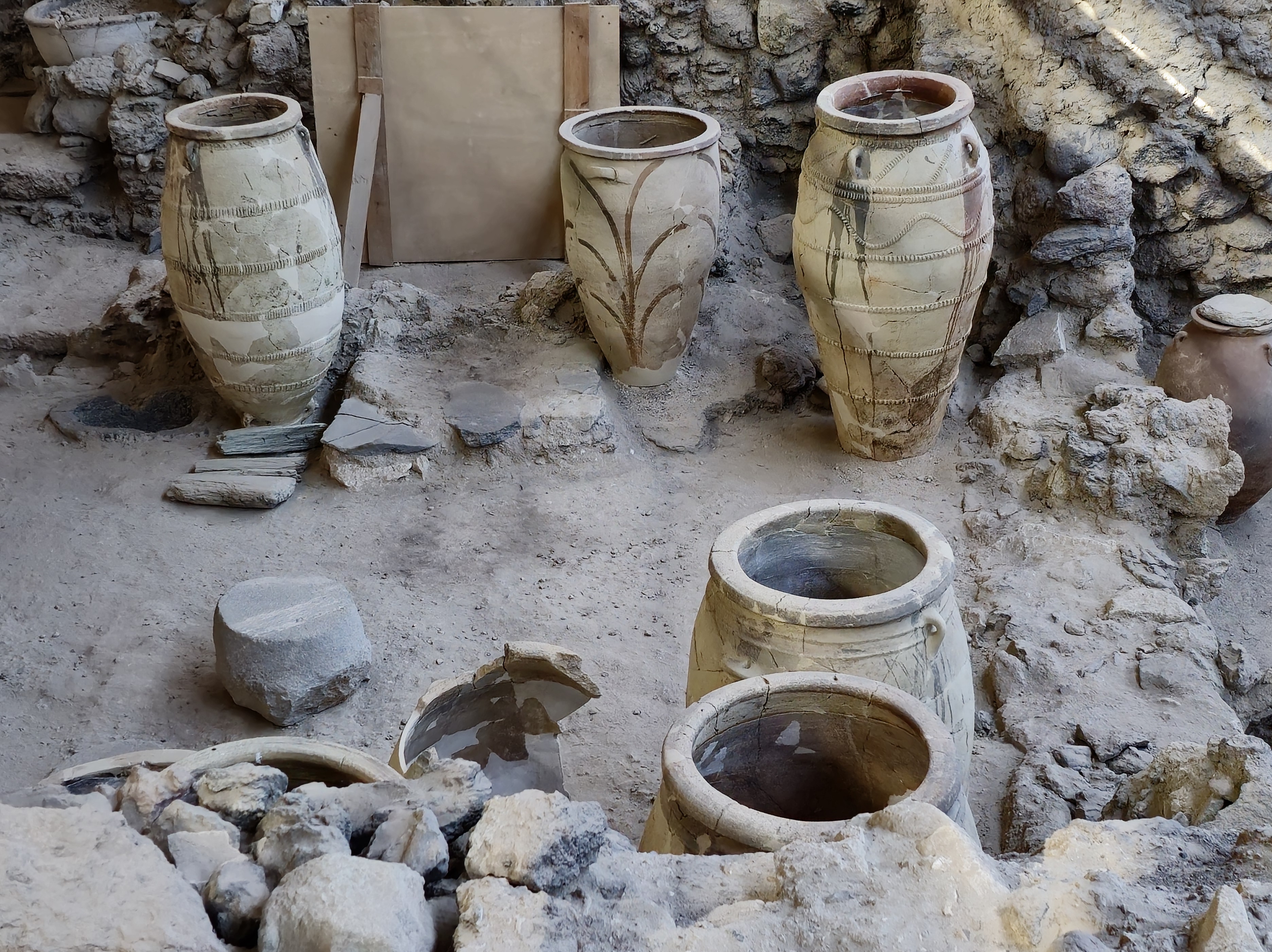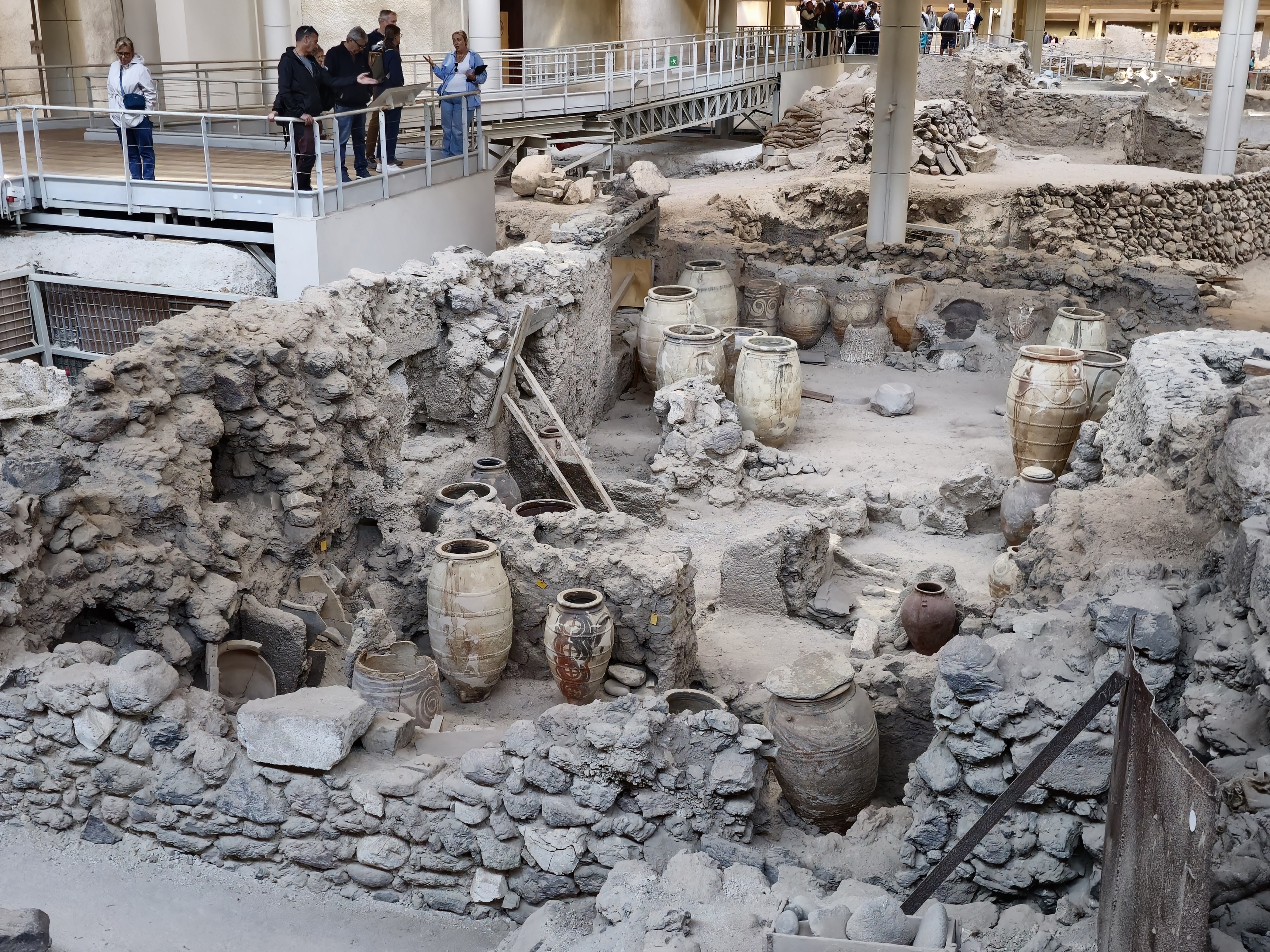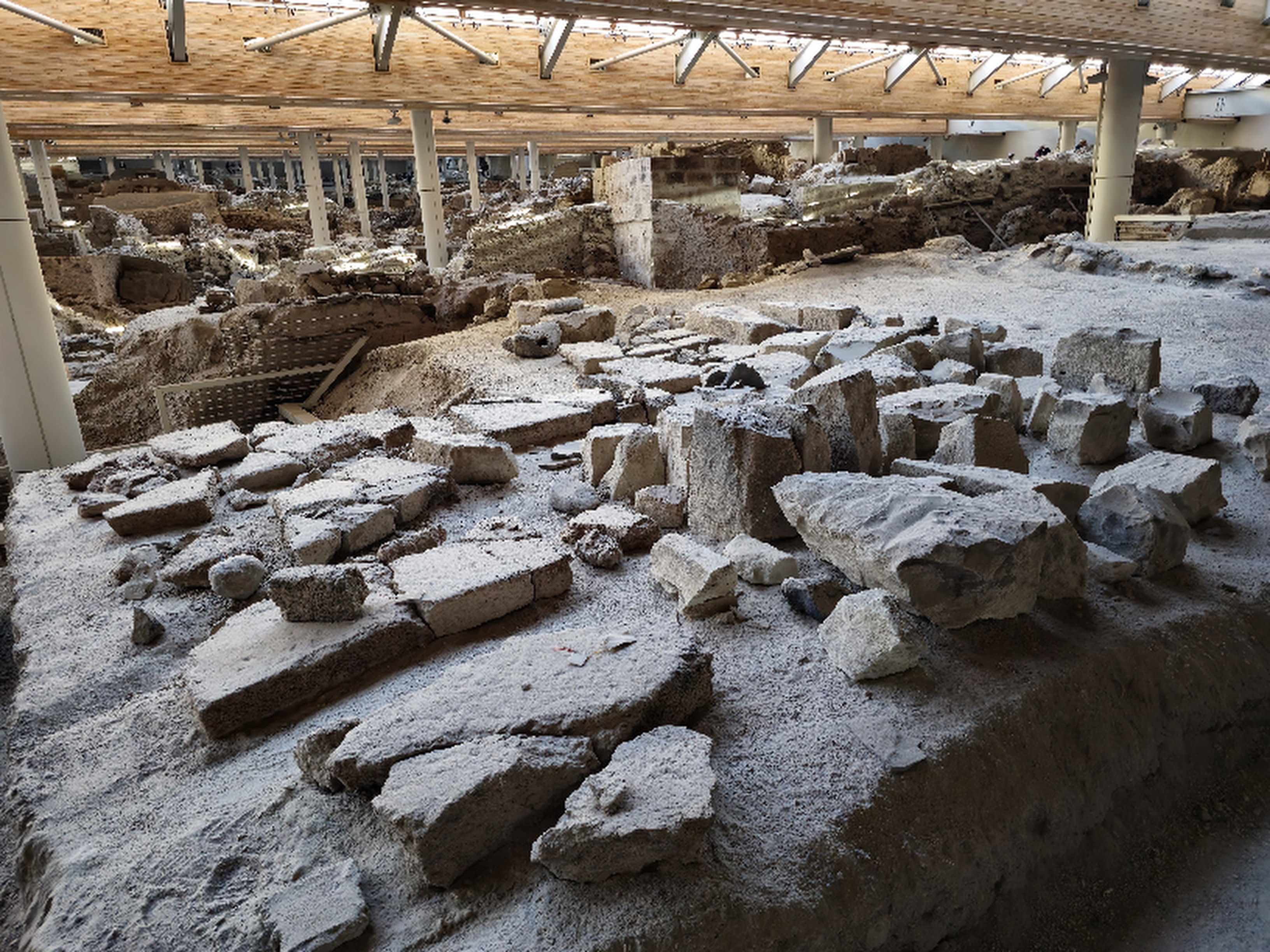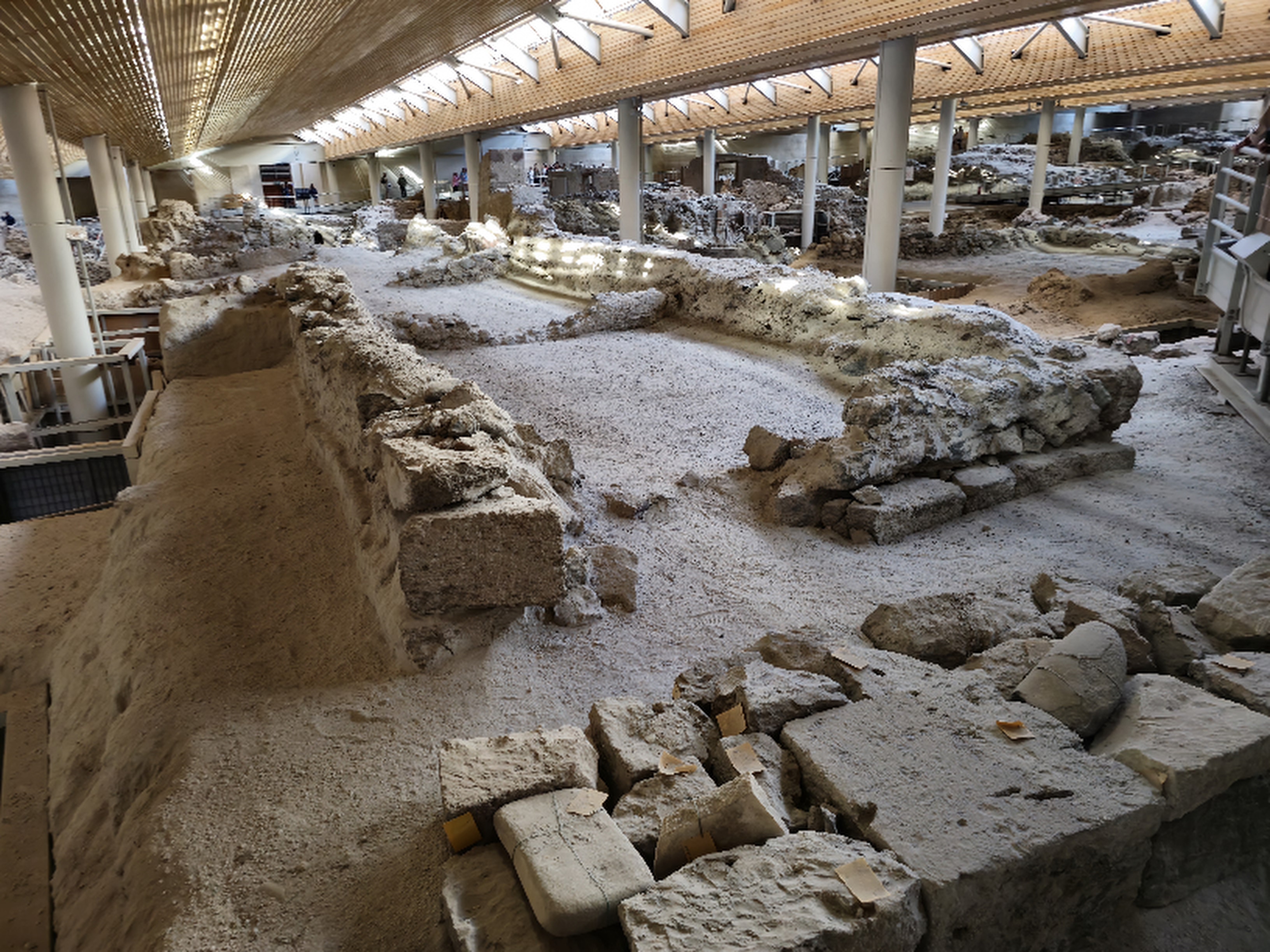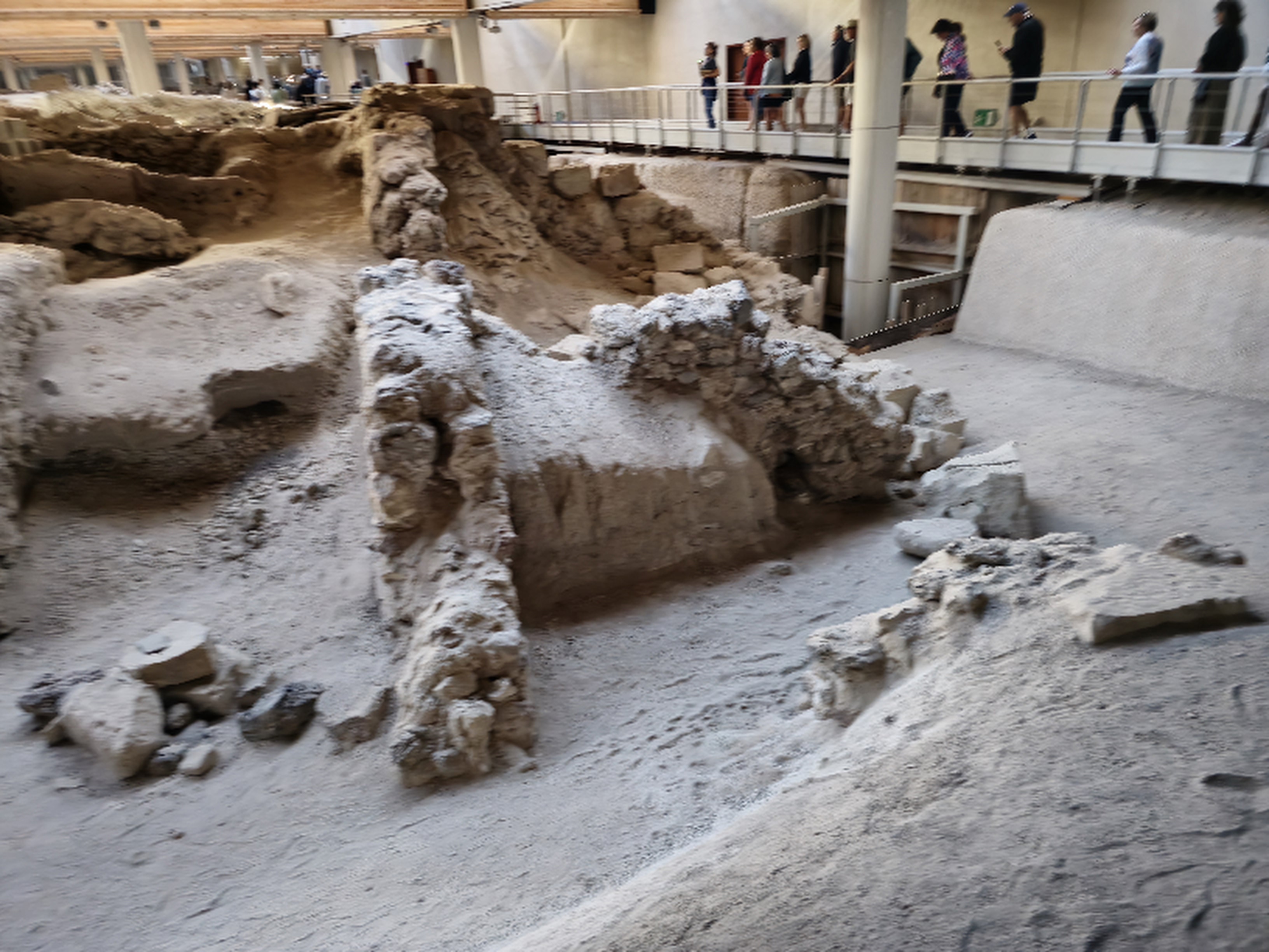 아크로티리는 유적 포진 범위가 다 확인된 것은 아닌 느낌을 받았는데 발굴현장 전체는 덧쒸움 시설을 했다.