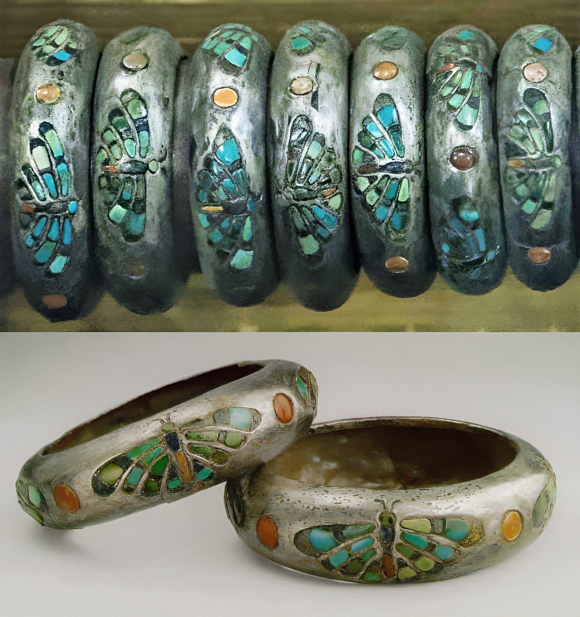 이집트에서 출토된 초기 은제 물건 중 하나로, 나비(은, 터키석turquoise, 라피스 라줄리lapis lazuli, 카르넬리안carnelian) 형태 반보석을 상감한 것이다.