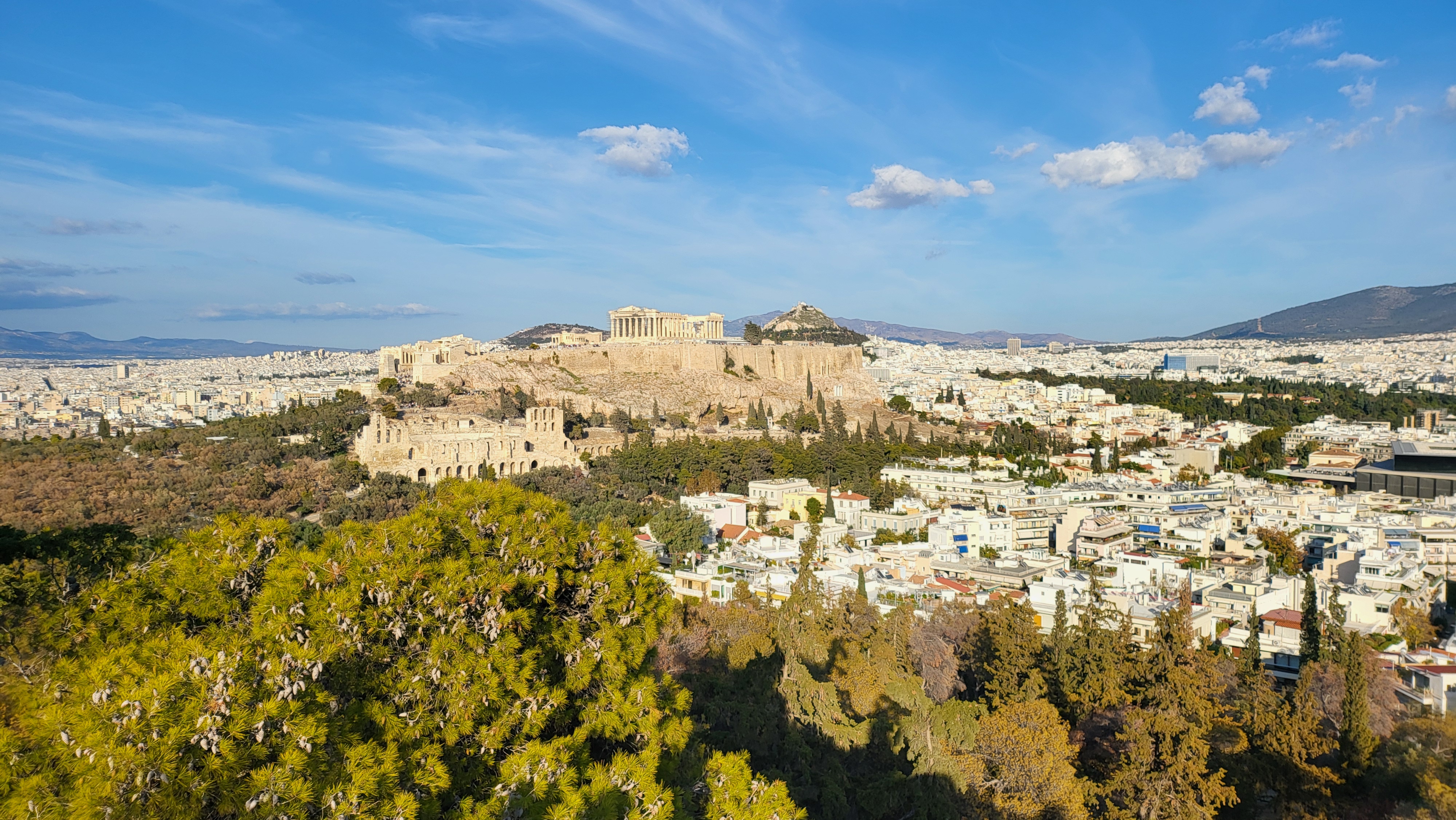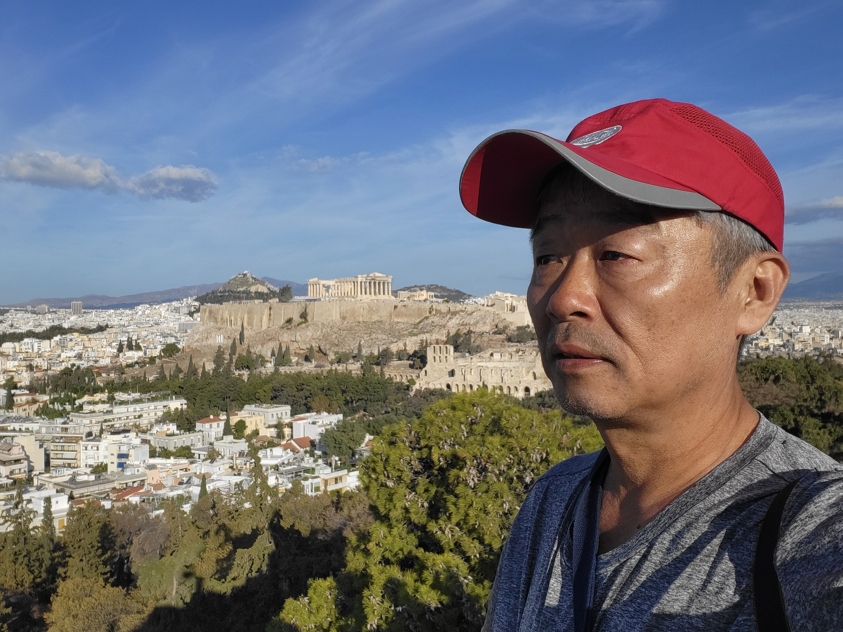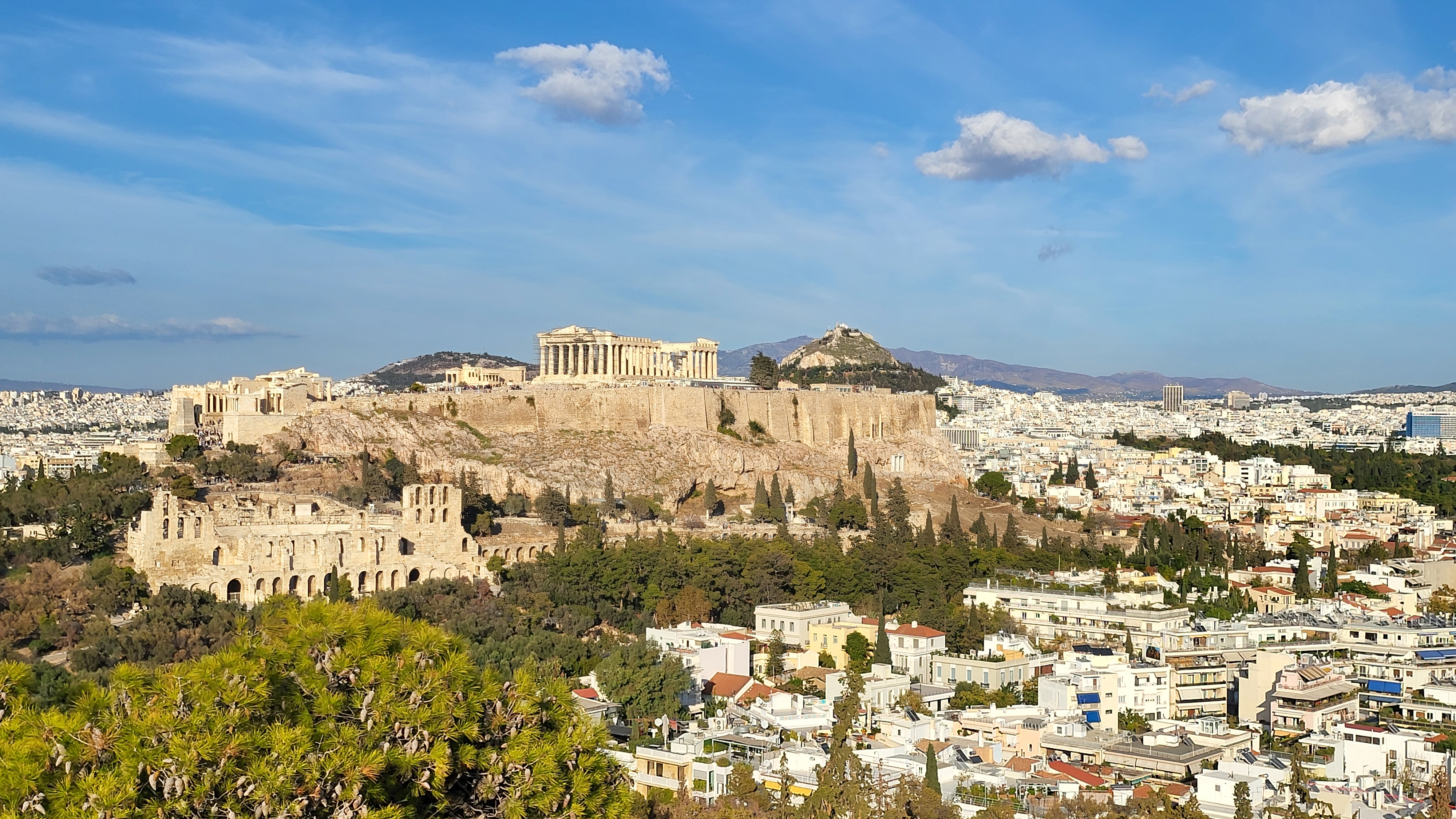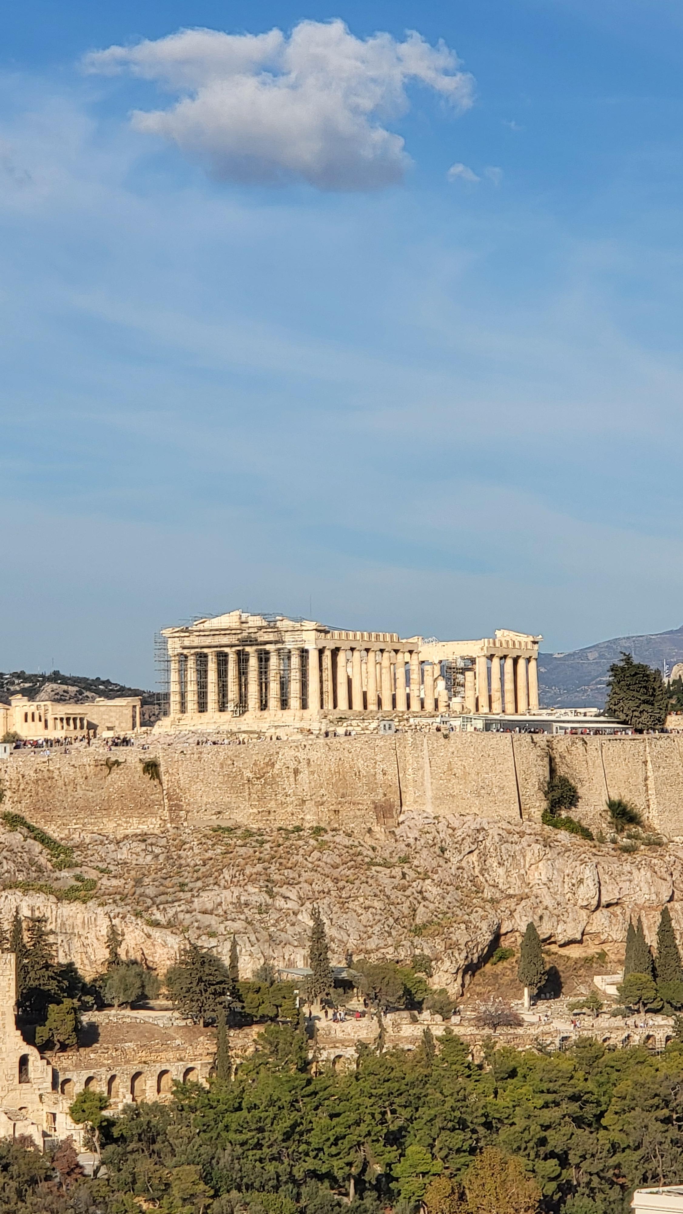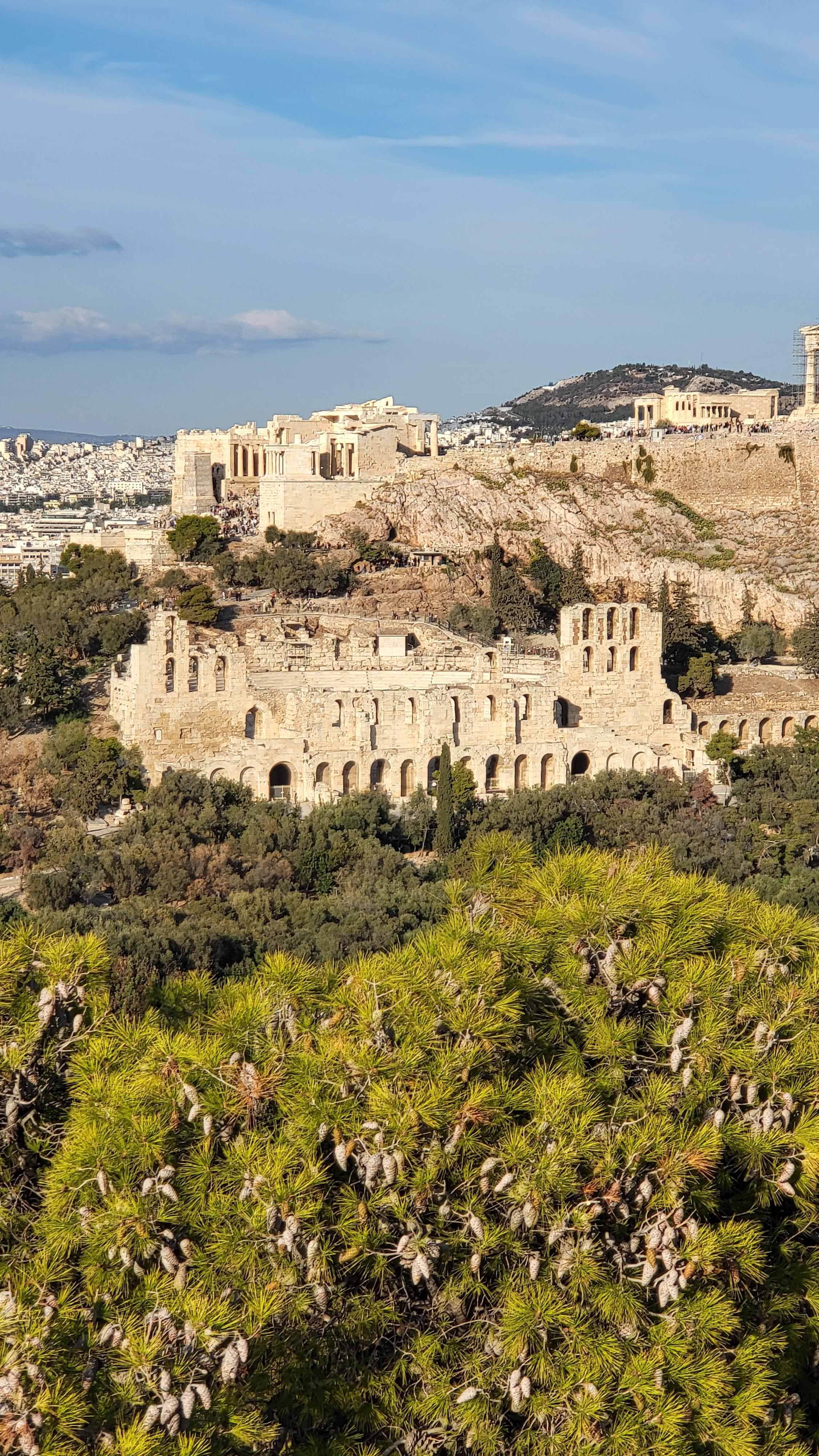 그래도 드론과 달리 저 언덕에서는 비록 수평 눈높이기기는 하지마는 아크로폴리스를 옆에서 같은 높이로, 그리고 내 눈으로 직접 조망한다는 이점이 있다.