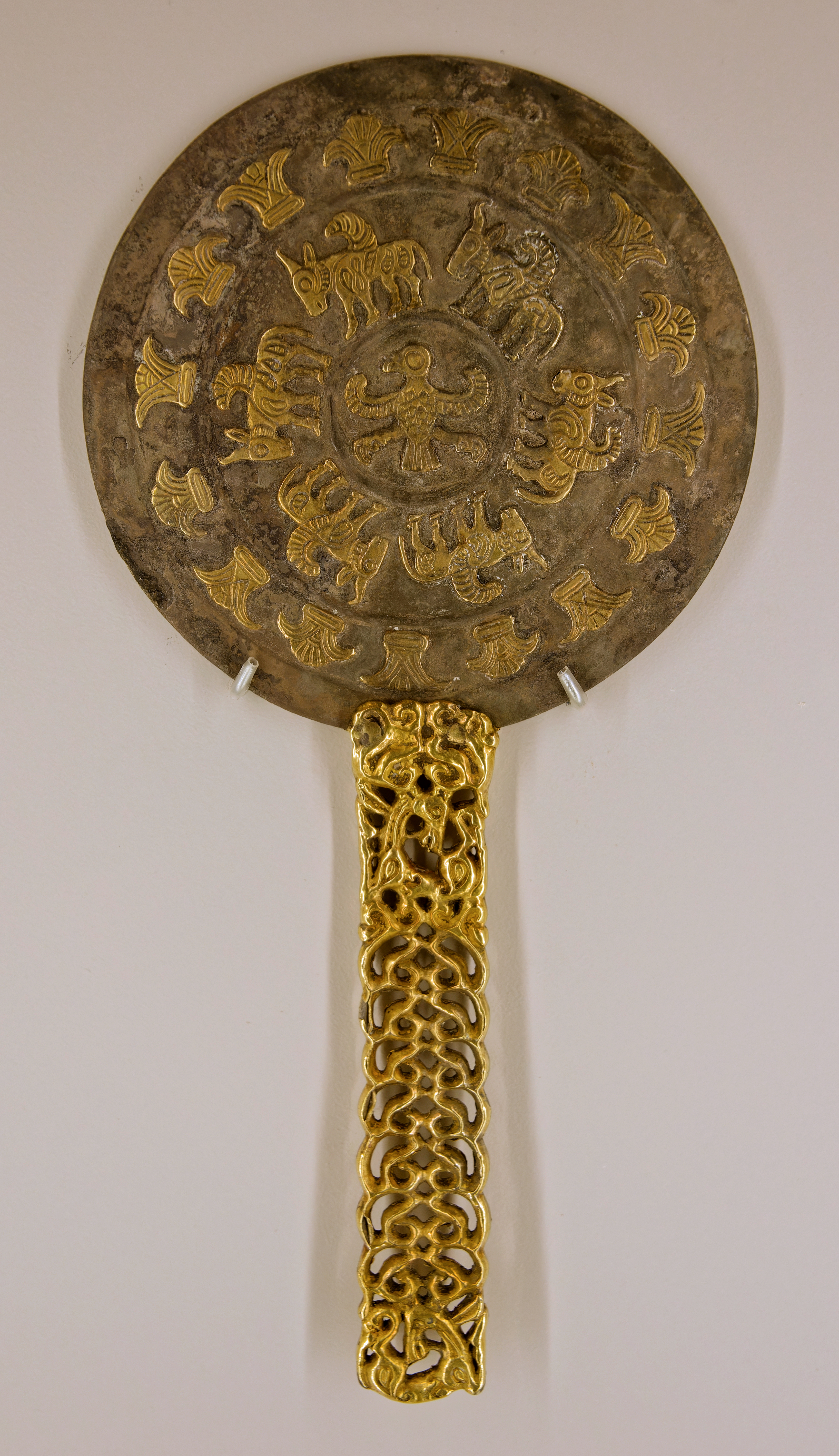 옷과 금 장신구를 착용하고 있었고 손에는 은색 거울이 들려 있었다.