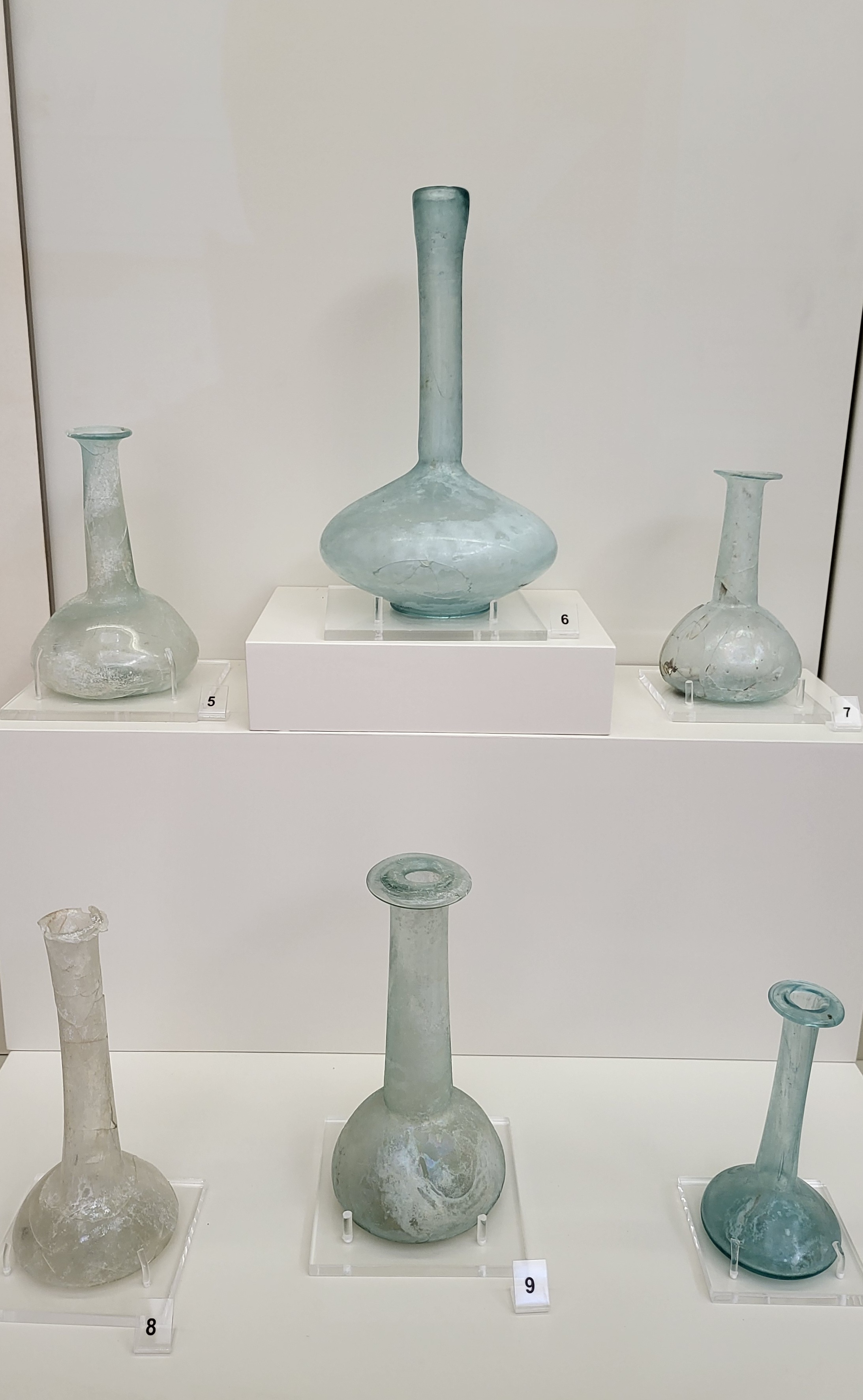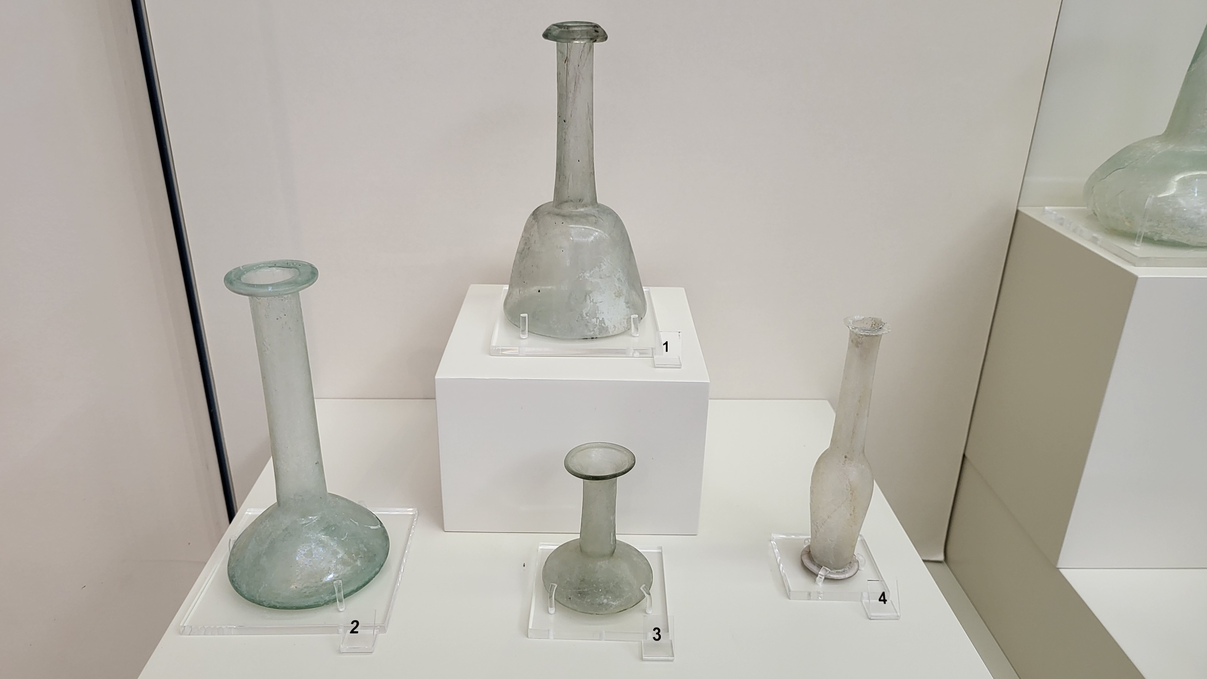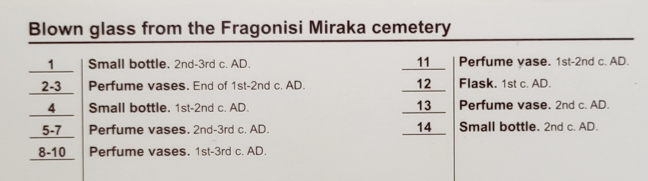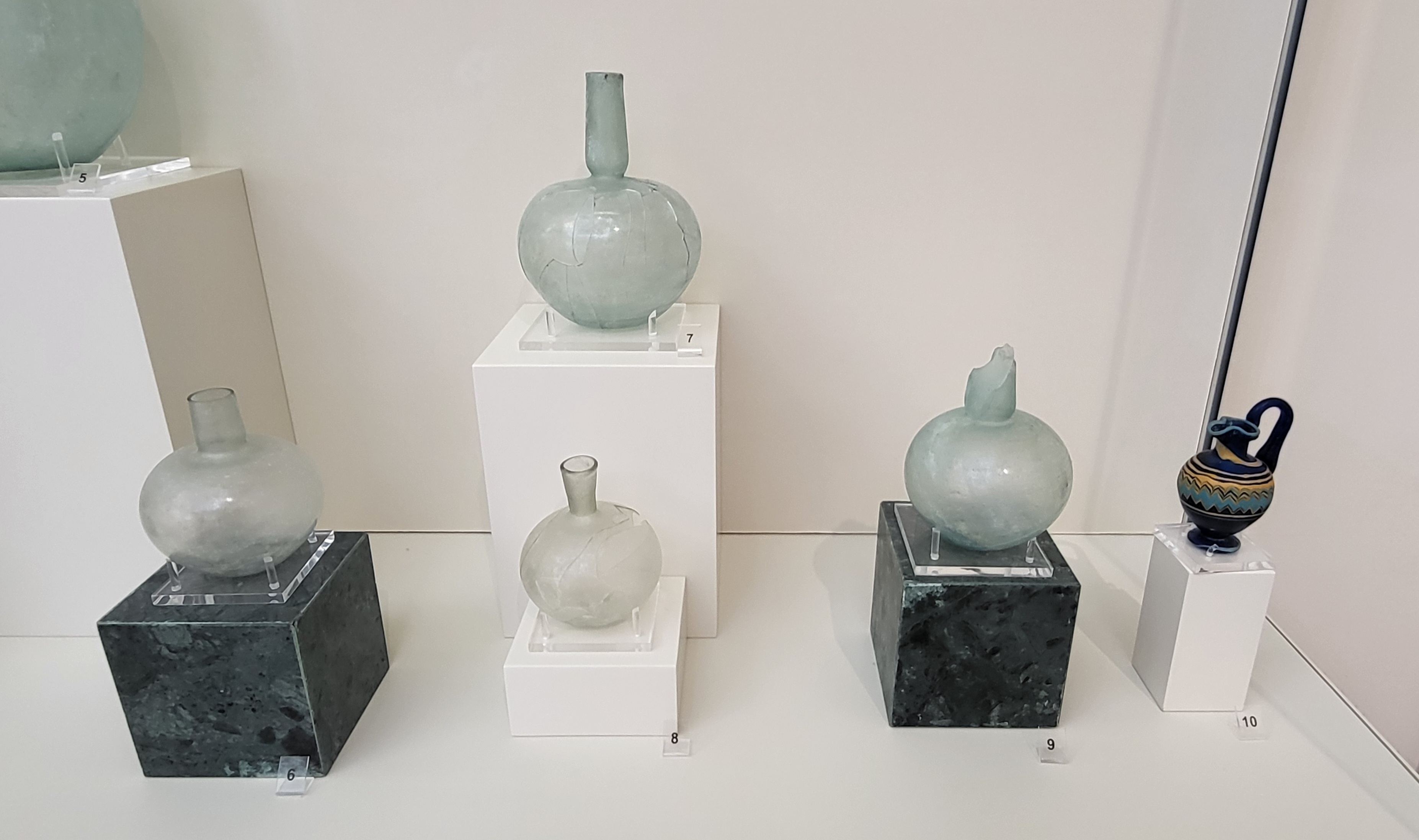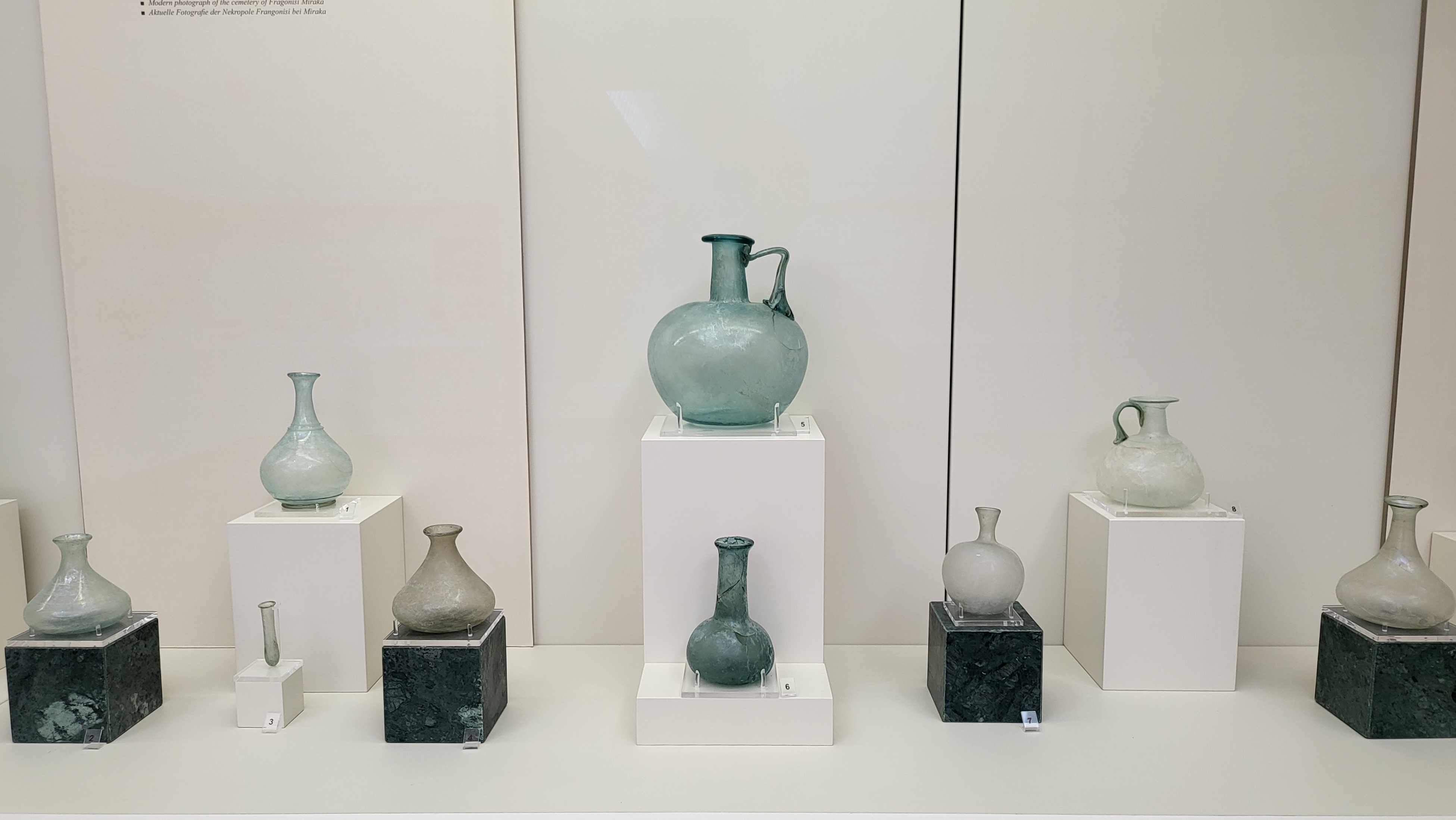 In dieser Vitrine und in den beiden folgenden sind Glasgefaße ausgestellt, die bei den Ausgrabungen in der Nekropole Fragonisi bei Miraka gefunden worden sind und als Grabbeigaben gedient haben. Sie sind geblasen und bestehen mehrheitlich aus durchsichtigem, farblosem Glas. Sie sind zwischen dem 1. und dem 4. Jh. n. Chr. entstanden.