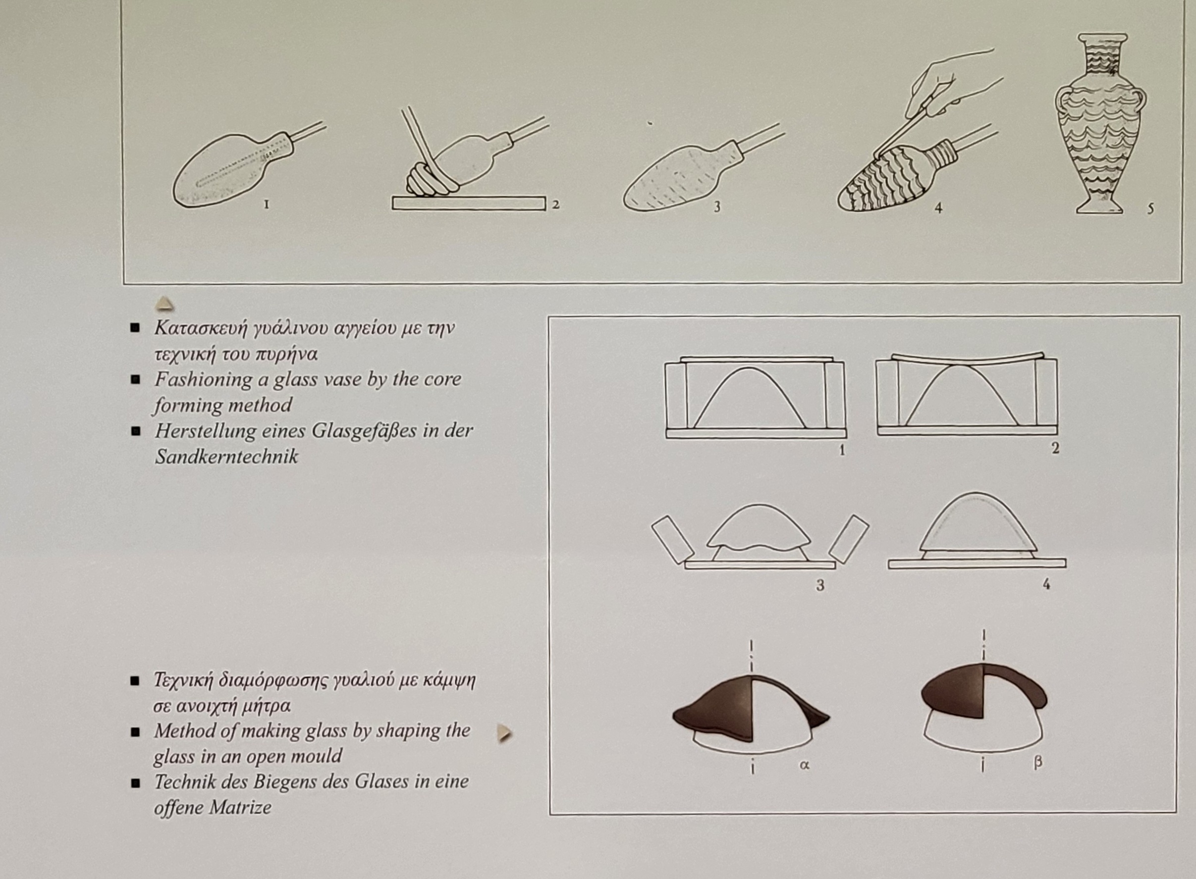 고대에 유리를 만드는 방법은 a) 코어 성형법 core forming method(기원전 6기 말부터) b) 몰드법 mould method(기원전 5기 -4기, 코어 성형법과 함께) c) 대롱불기법 blowing method(기원전 1기 중반부터)의 세 가지였다.