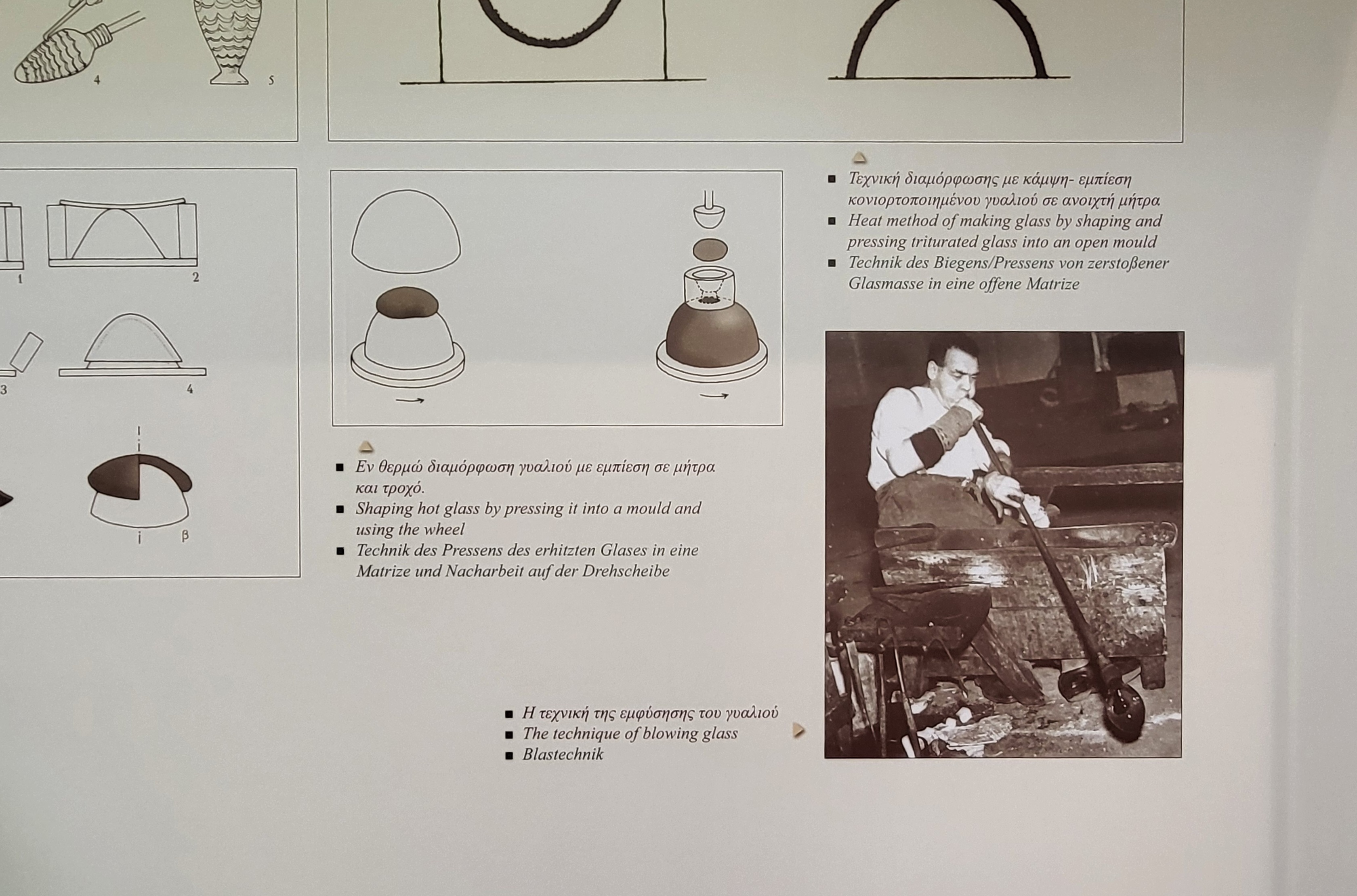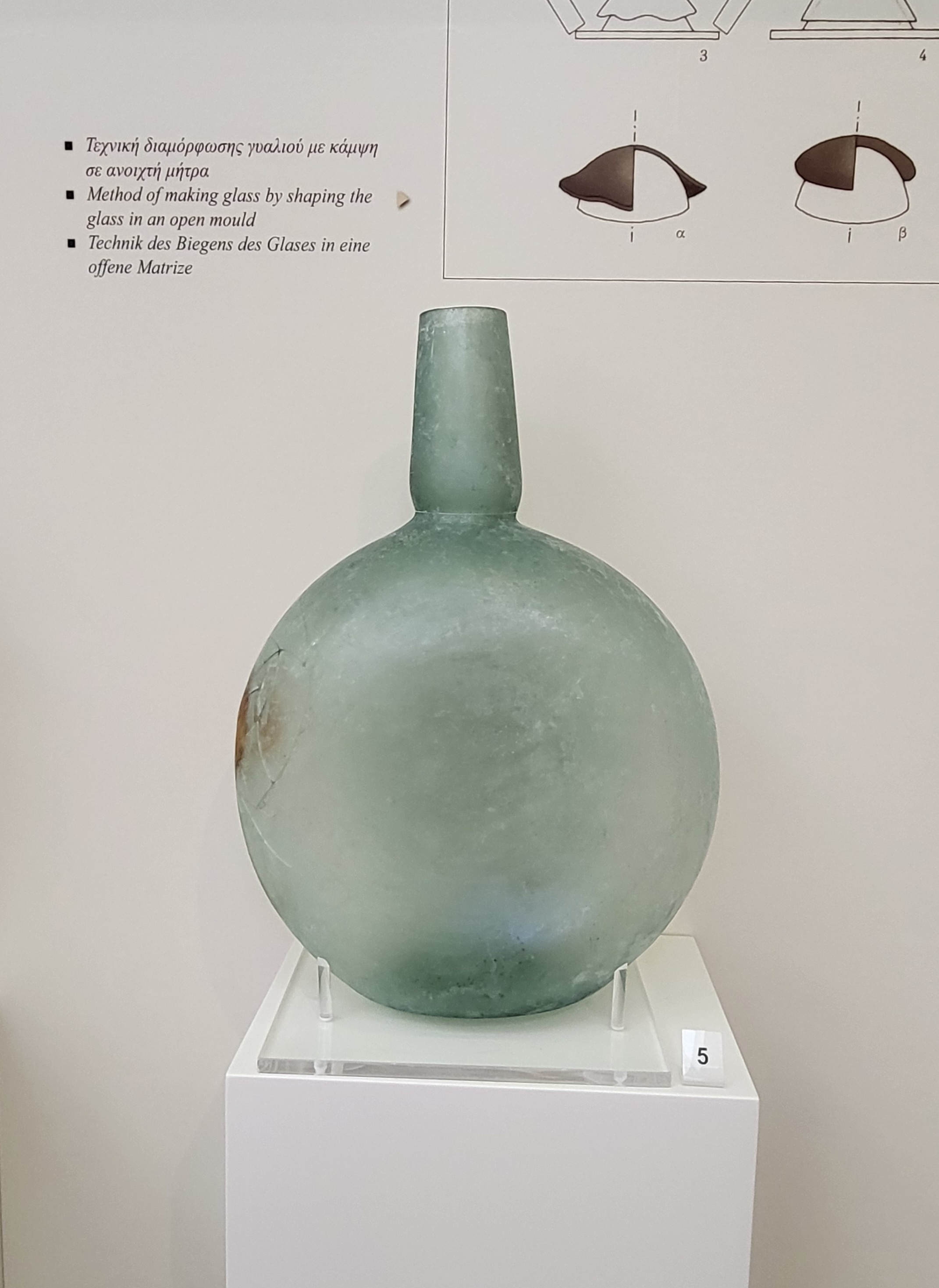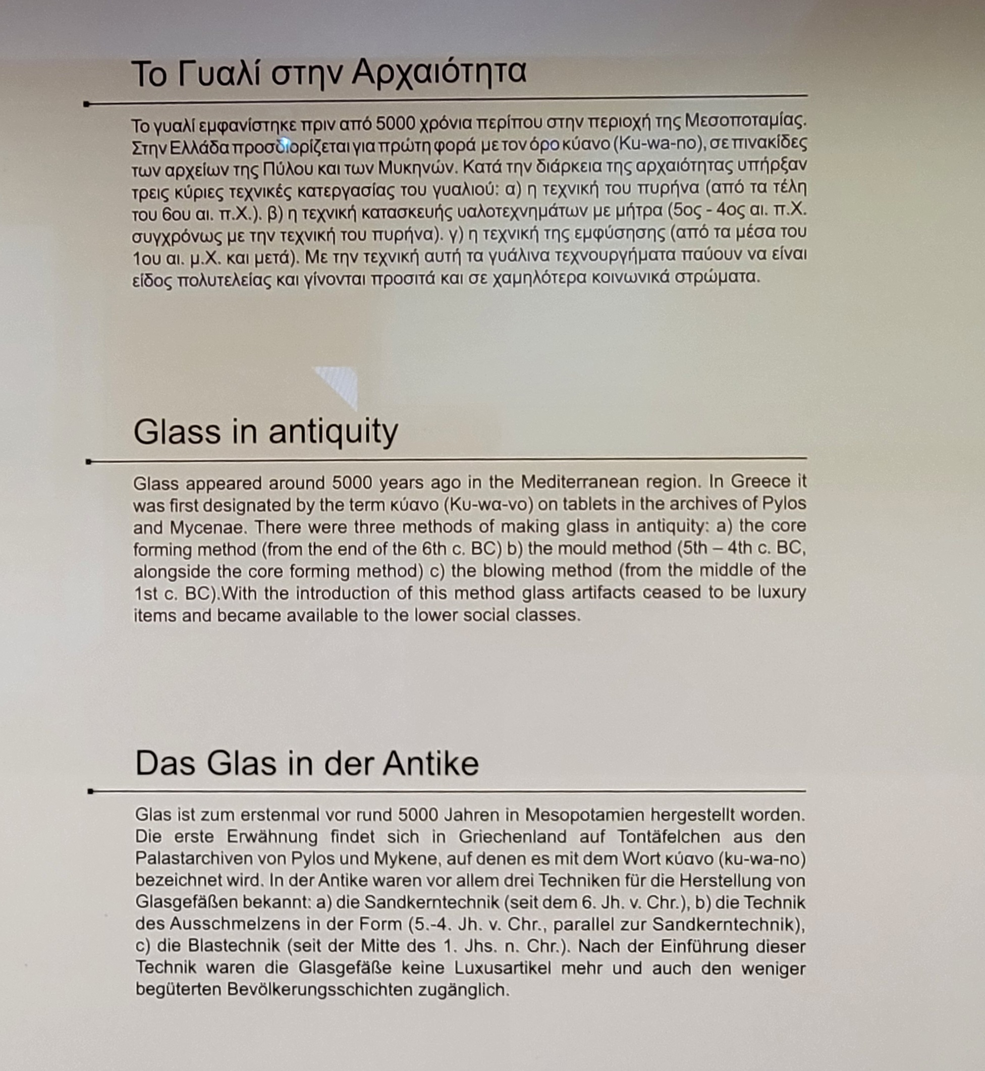 Glass appeared around 5000 years ago in the Mediterranean region. In Greece it was first designated by the term kúavo (Ku-wa-vo) on tablets in the archives of Pylos and Mycenae. There were three methods of making glass in antiquity: a) the core forming method (from the end of the 6th c. BC) b) the mould method (5th -4th c. BC, alongside the core forming method) c) the blowing method (from the middle of the 1st c. BC). With the introduction of this method glass artifacts ceased to be luxury items and became available to the lower social classes.