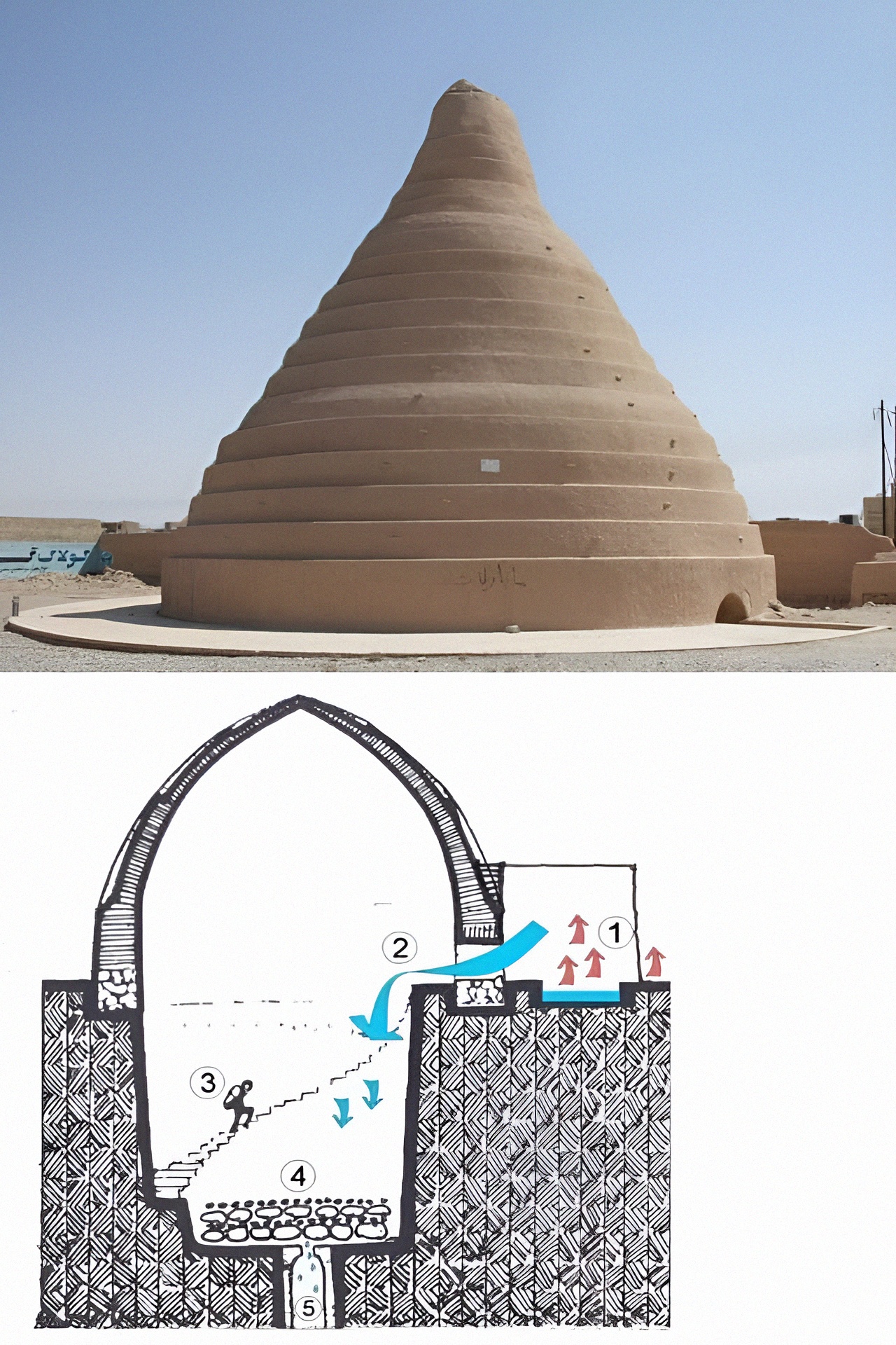 아케메네스 페르시아 제국 시절 사막 한가운데에서 제빙시설인 야흐찰 Yakhchal 혹은 “얼음 구덩이 Ice Pit” 모식도다.