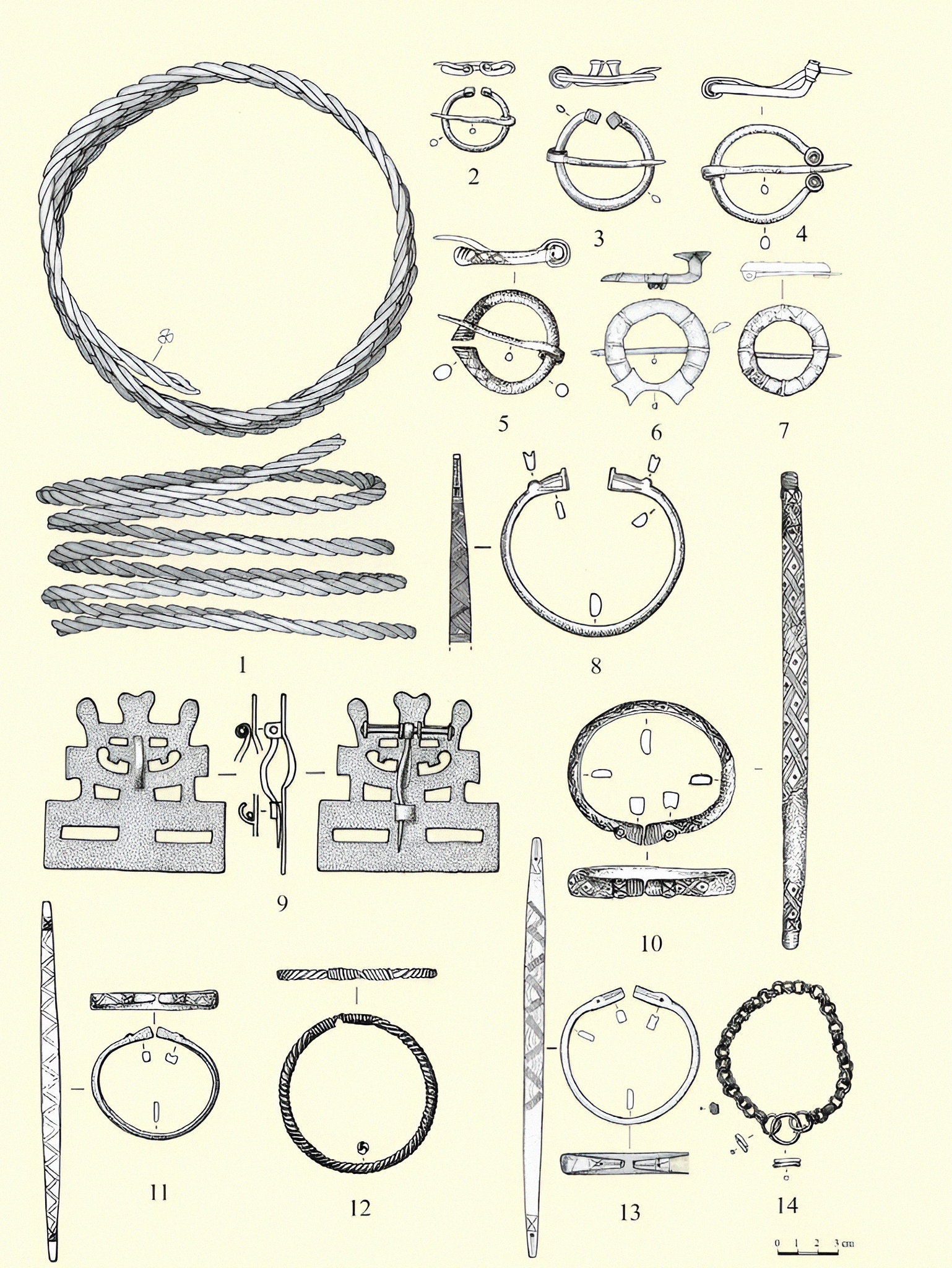 남자들은 도끼, 선창, 칼을 포함한 다양한 무기와 함께 묻혔고, 일부 여자는 그 시대 여성의 사회적 표식으로 여겨진 복잡한 청동 목고리 bronze neck rings 로 장식되었다.