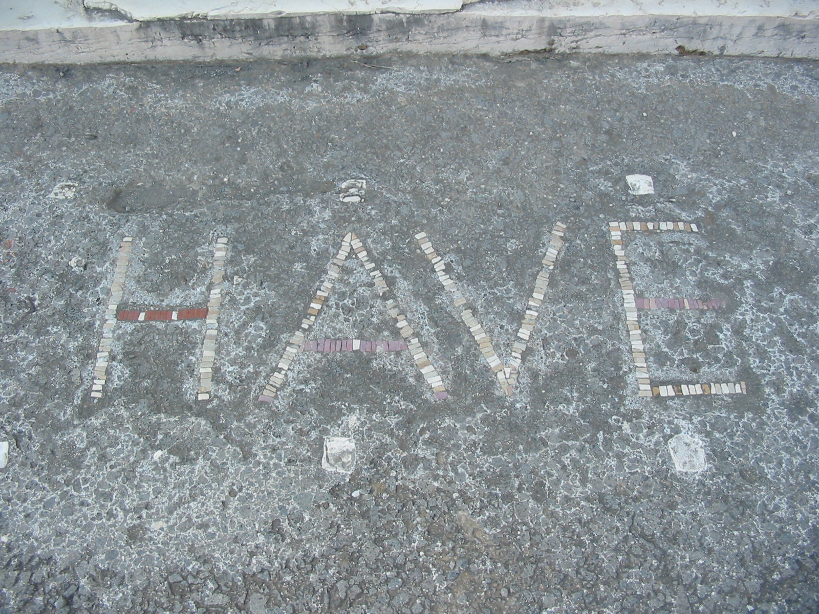 집 입구는 빨간색과 흰색 돌로 장식했으며 라틴어 메시지 "HAVE"가 적혀 있다.