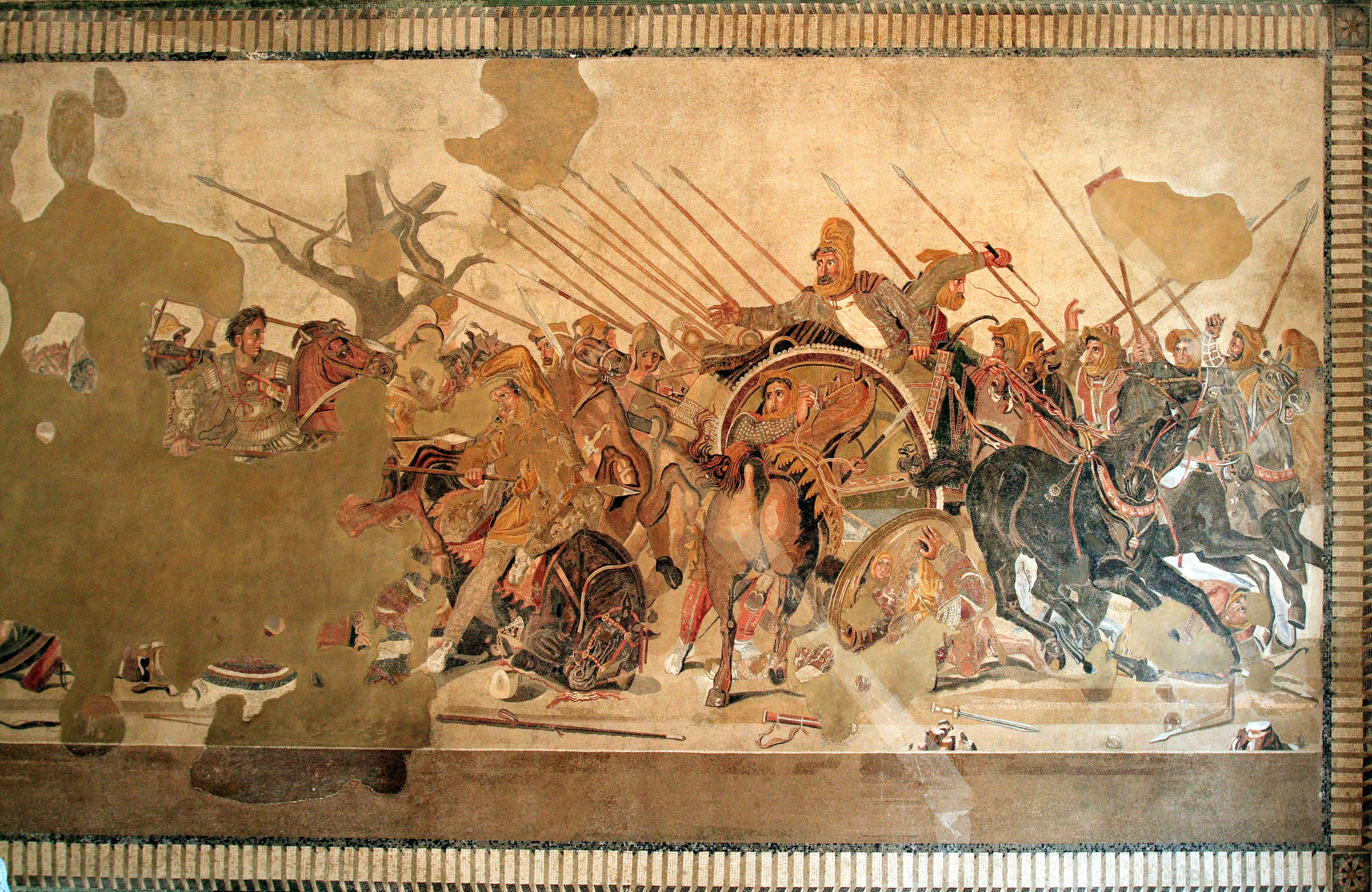 1830년대에 처음 발견되었을 때 모자이크는 일리아드Iliad에 묘사된 전투 장면을 나타내는 것으로 생각했지만 건축 역사가들은 이 모자이크가 실제로 기원전 333년 알렉산더 대왕과 페르시아 다리우스 3세 사이에 벌어진 이수스 전투 Battle of Issus 를 묘사하고 있음을 발견했다.