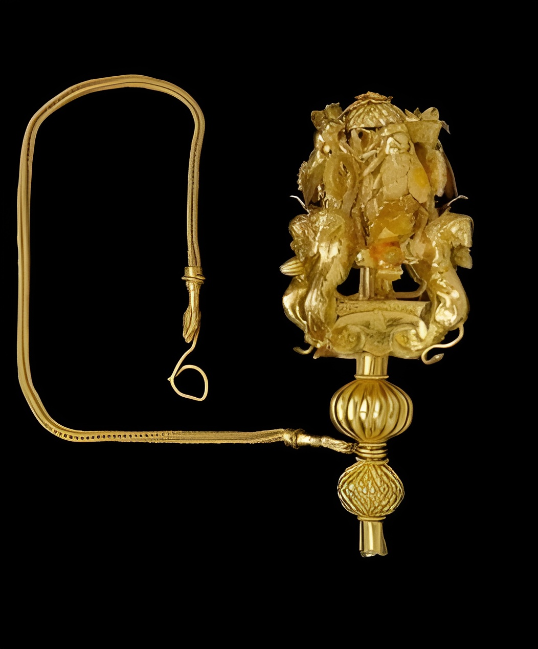 사자, 벌, 아이오니아 기둥, 그리고 잎을 장식한 핀의 머리다.
