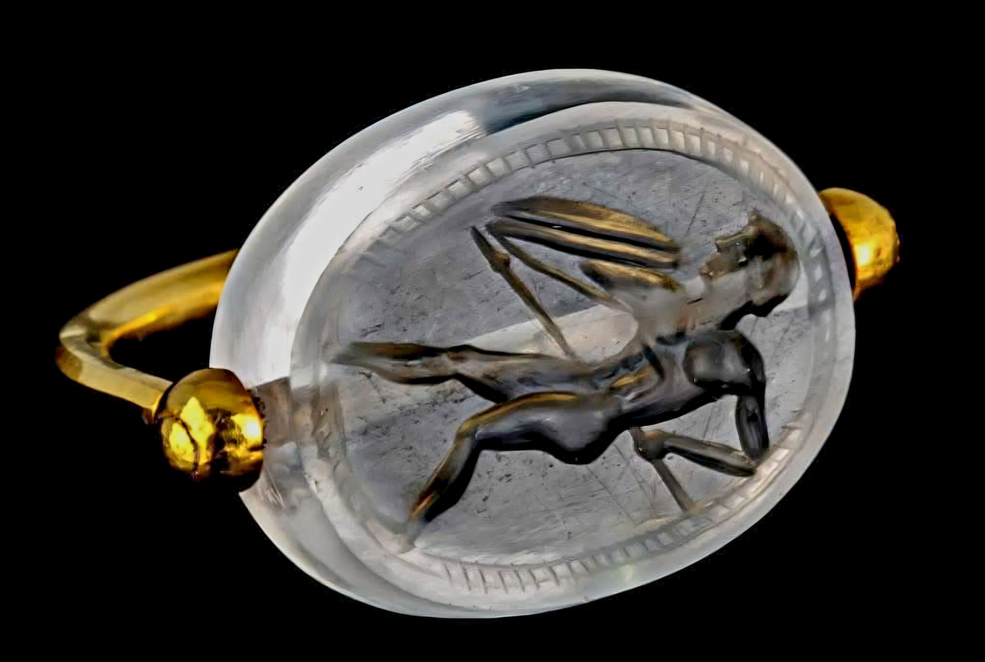 Thracian stamp ring made of gold and chalcedony, featuring an engraved figure of a warrior. It dates back to the second half of the 5th century B.C. Currently housed in the Archaeological Museum of Plovdiv, Bulgaria