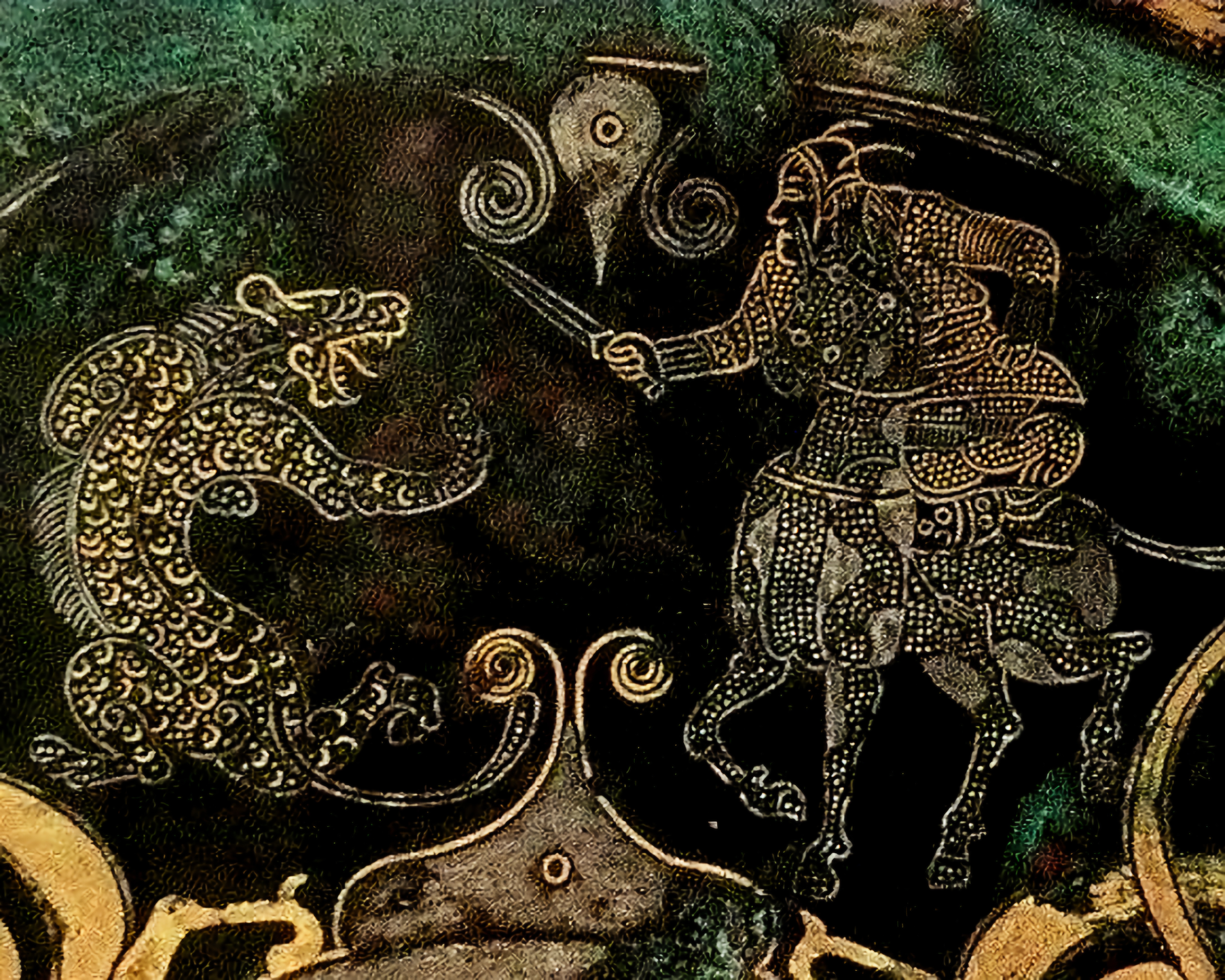 The back of a gilded mirror decorated with a hunting scene, discovered in Jin village, Luoyang, Henan, China. Warring States period, c. 475–221 BCE, now at the Eisei Bunko Museum in Tokyo. Image courtesy of ChenDaoIsHere