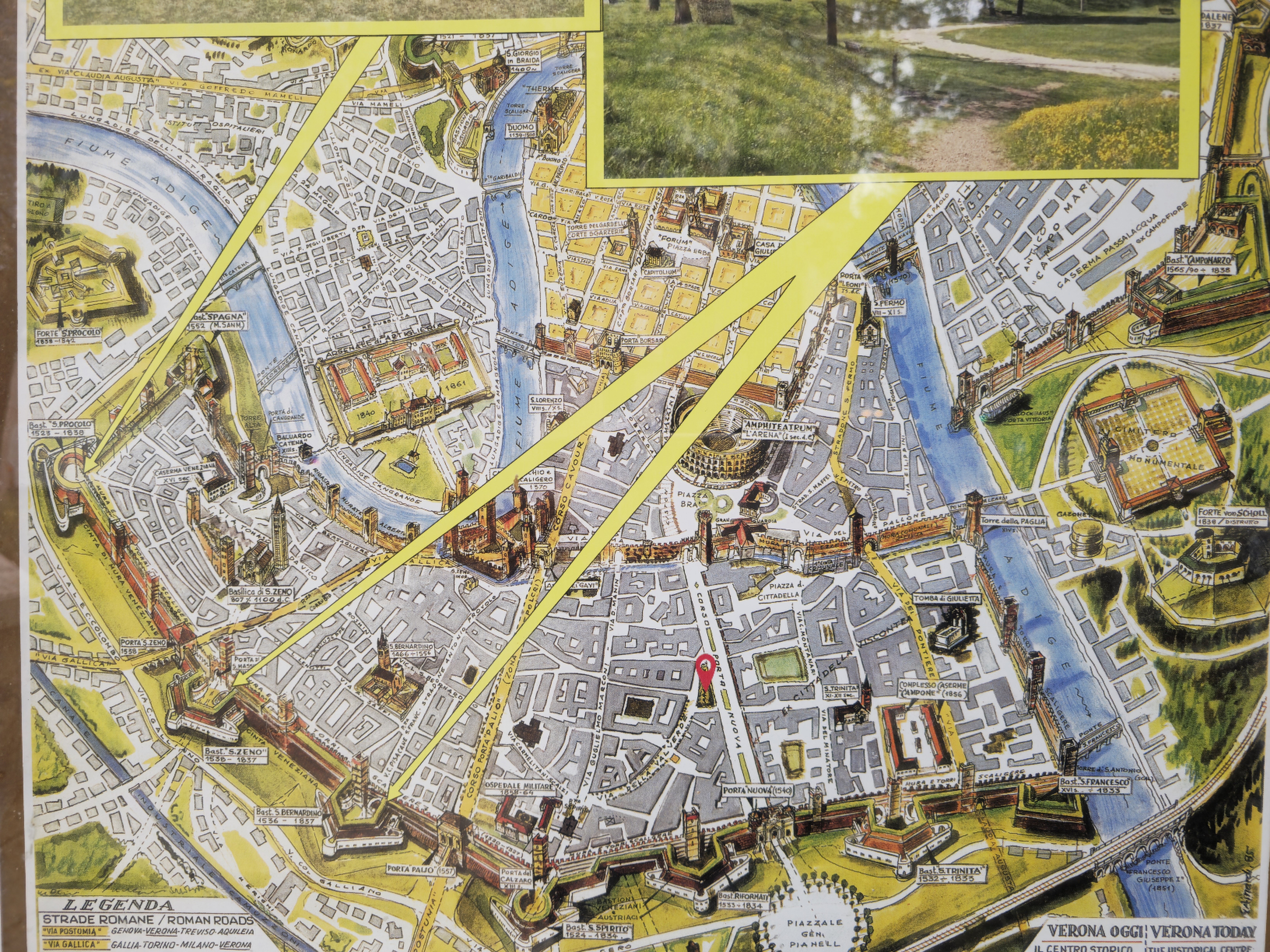 베로나는 서쪽에서 흘러내린 아디제 강이 느닷없이 북쪽으로 흐름을 바꿨다가 다시 남하하면서 다시 동쪽으로 빠져나가는 꼭지지점을 중심으로 발달한 도시거니와