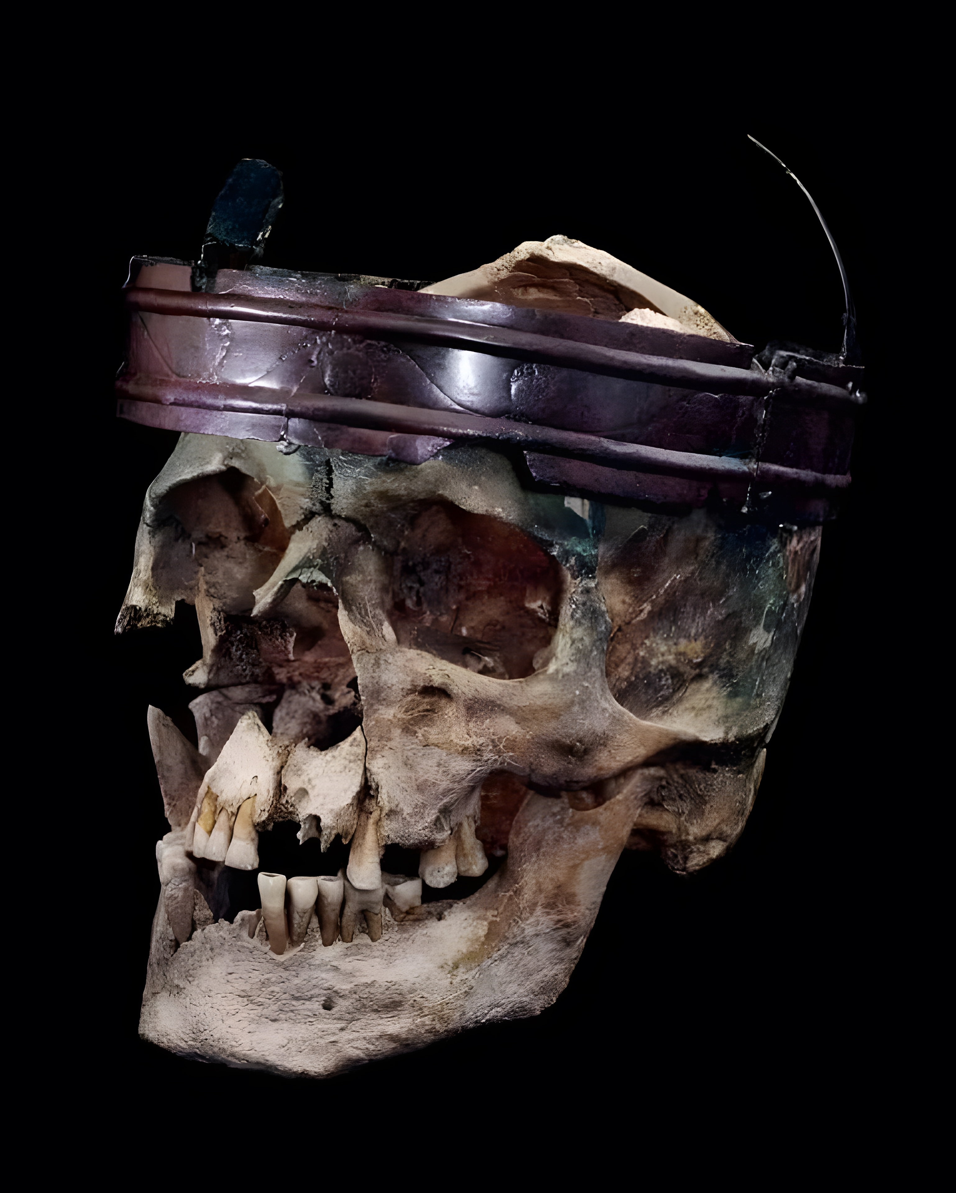 주인 두개골에서 여전히 제자리를 지키며 발견된 구리 합금 copper alloy 크라운