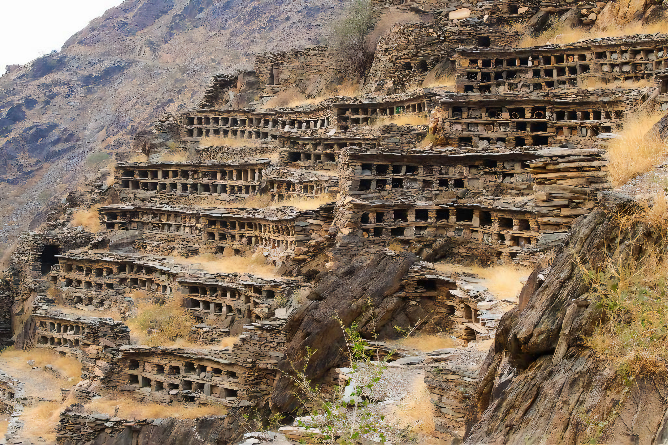 사우디아라비아 서부 사라와트 산맥 Sarawat Mountain range 기슭 타이프Taif 남쪽에 위치한 버려진 마을 알카르피Al-Kharfi에서 천년 전 고대 벌집beehives이 1천200통이나 떼거리로 있다고.