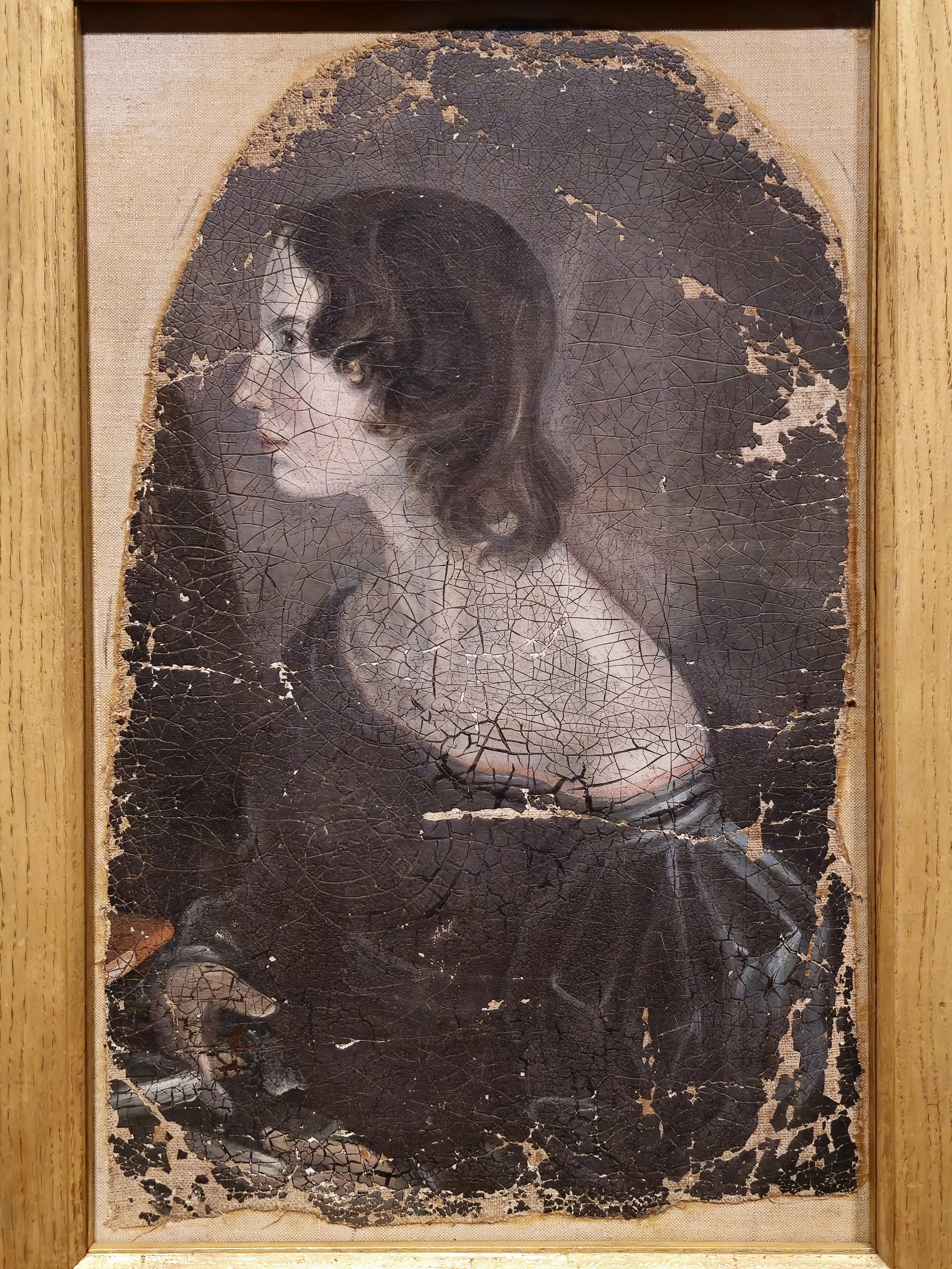 This painting of novelist and poet Emily Brontè is the only surviving fragment of a lost group portrait that included her siblings, Anne, Charlotte and Branwell, the latter who painted the portrait. It was discovered at the same time as the portrait on the left,
