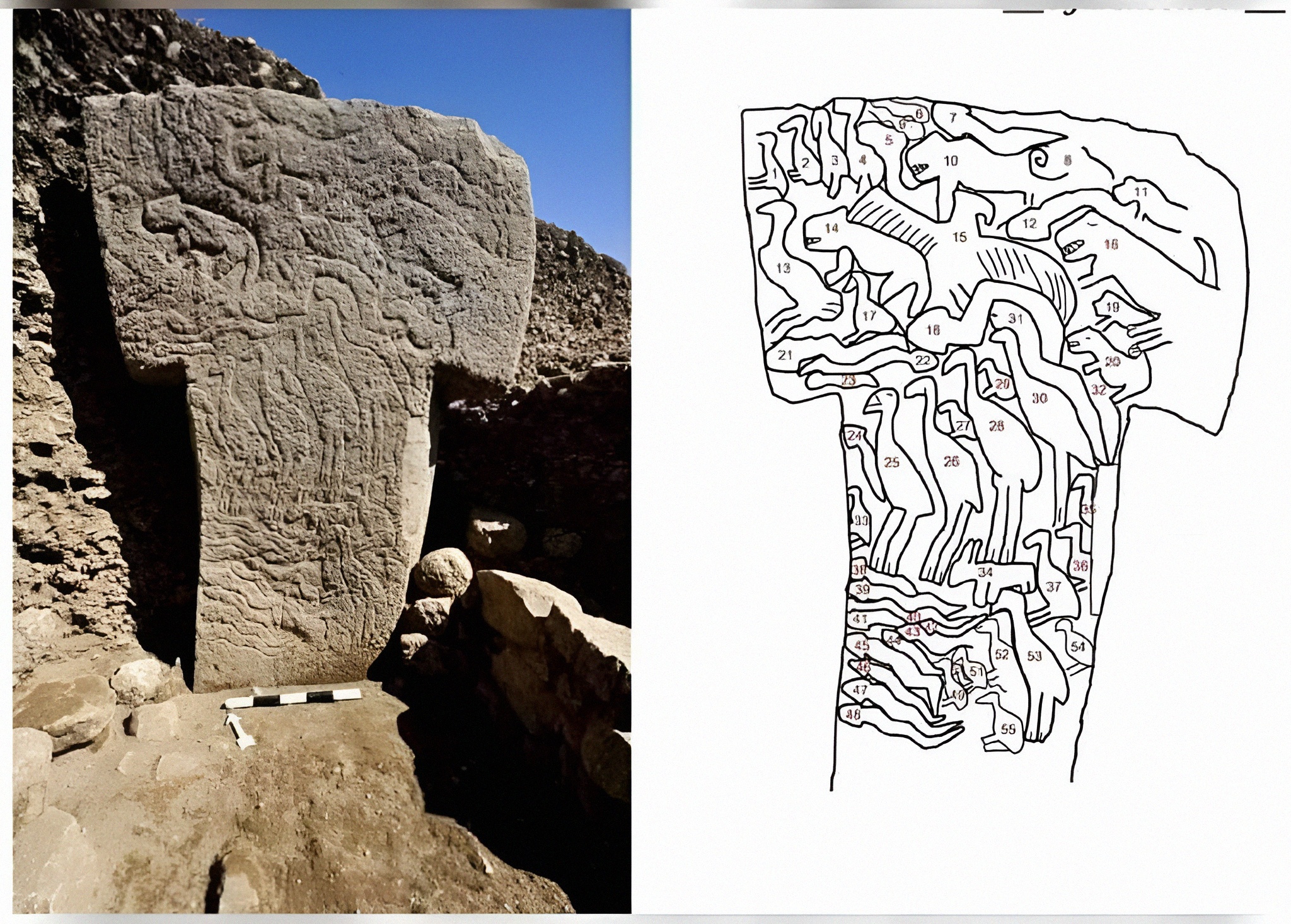 튀르키예 괴베클리 테페 Göbekli Tepe 라는 세계 역사 미스터리한 유적에서 드러난 석주와 그에 새긴 문양이다.