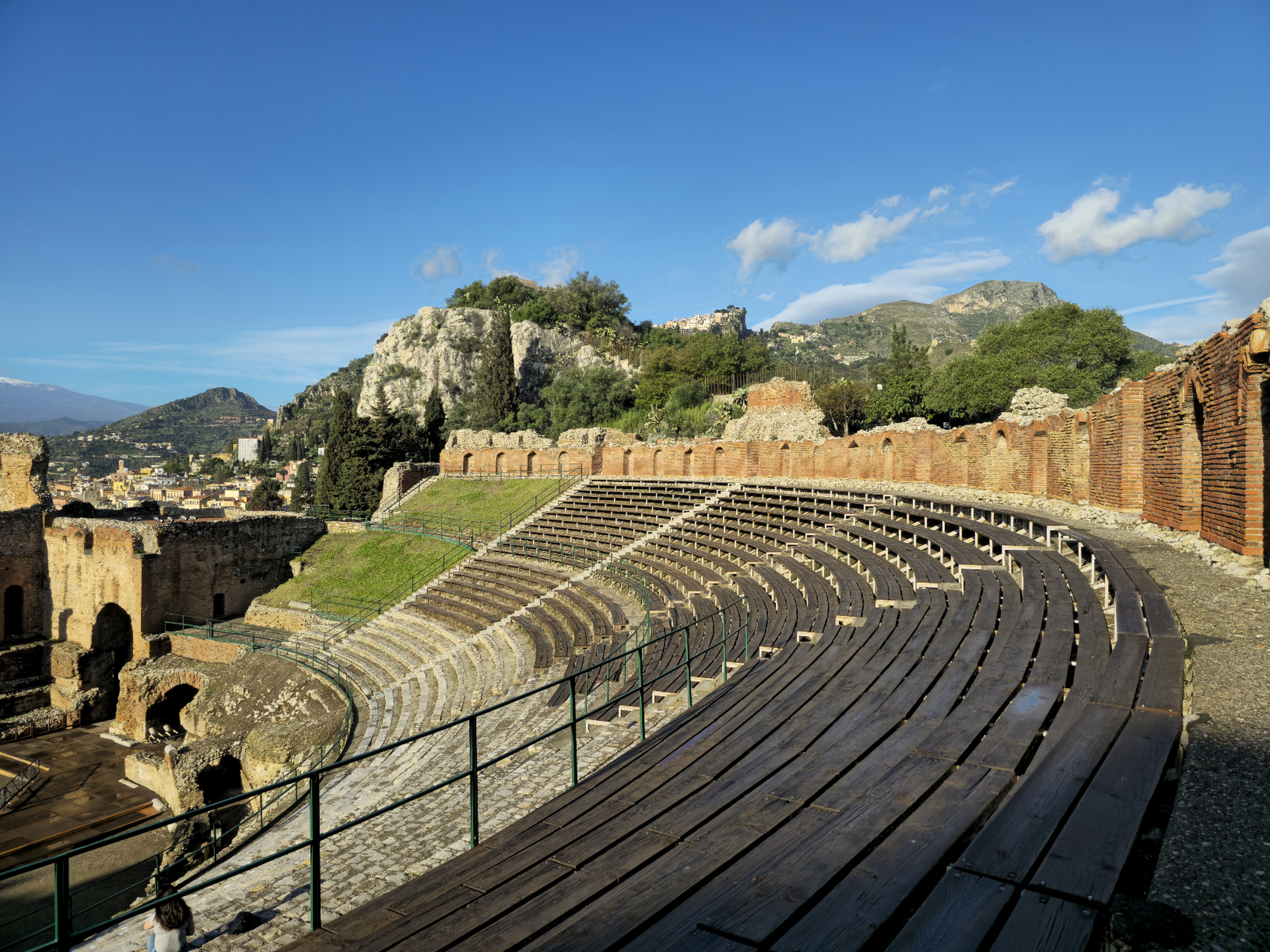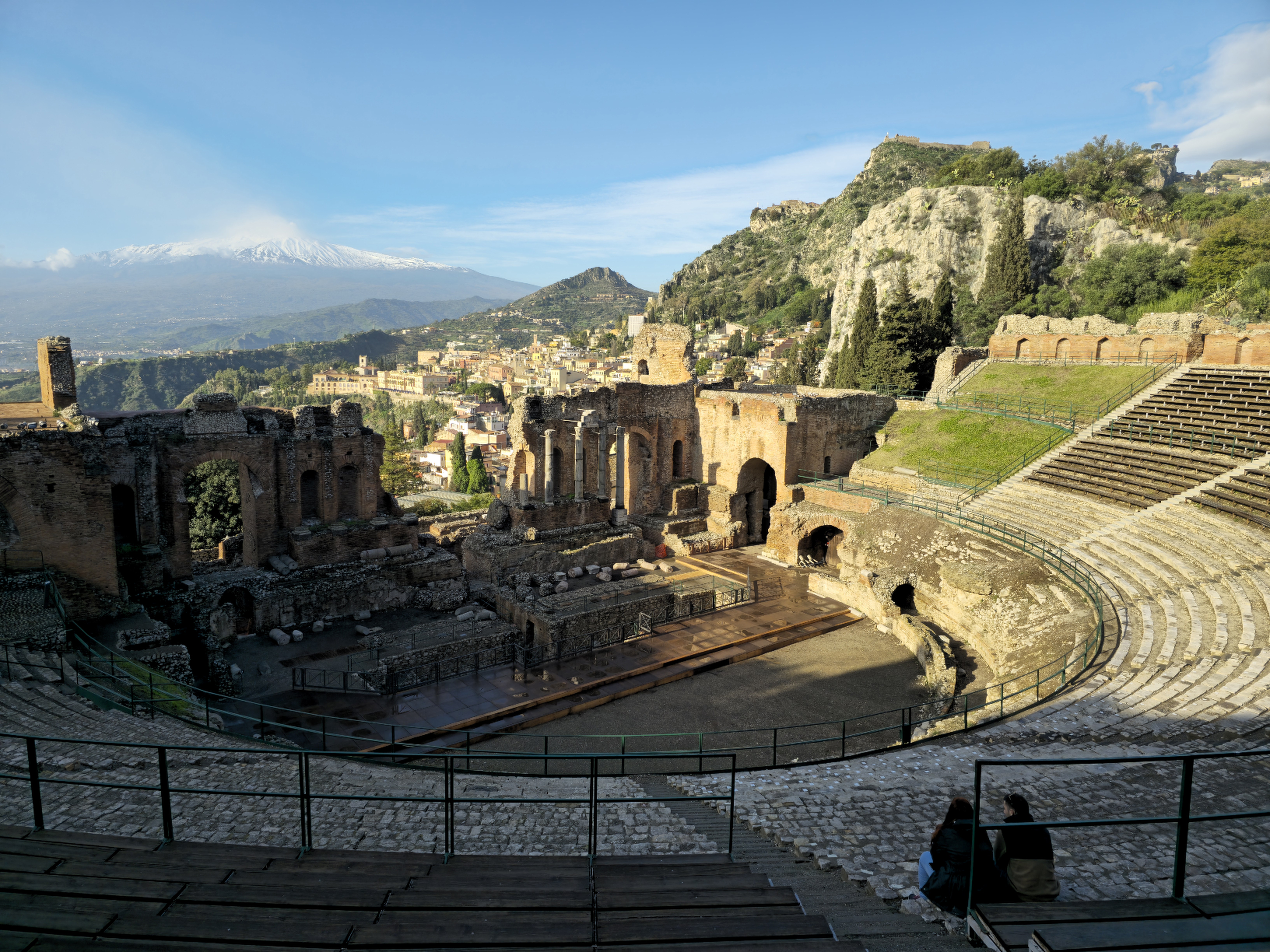 이곳 로마시대 극장이 아주 잘 남았는데 전면으로는 눈덮힌 에트나 산을 마주한다.