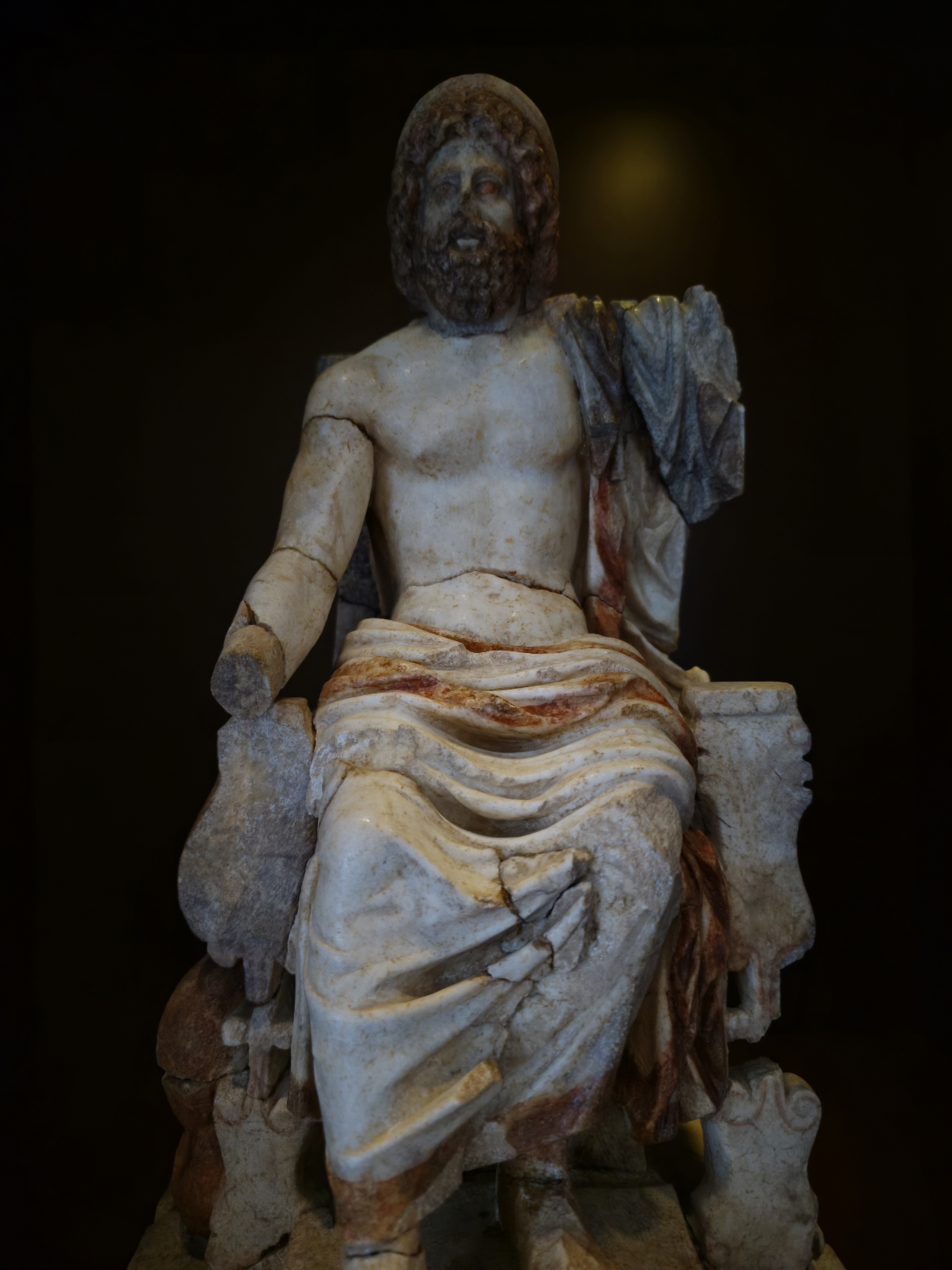 Marble small scale statue of enthroned Asklepios 3"/4"h c.A.C.